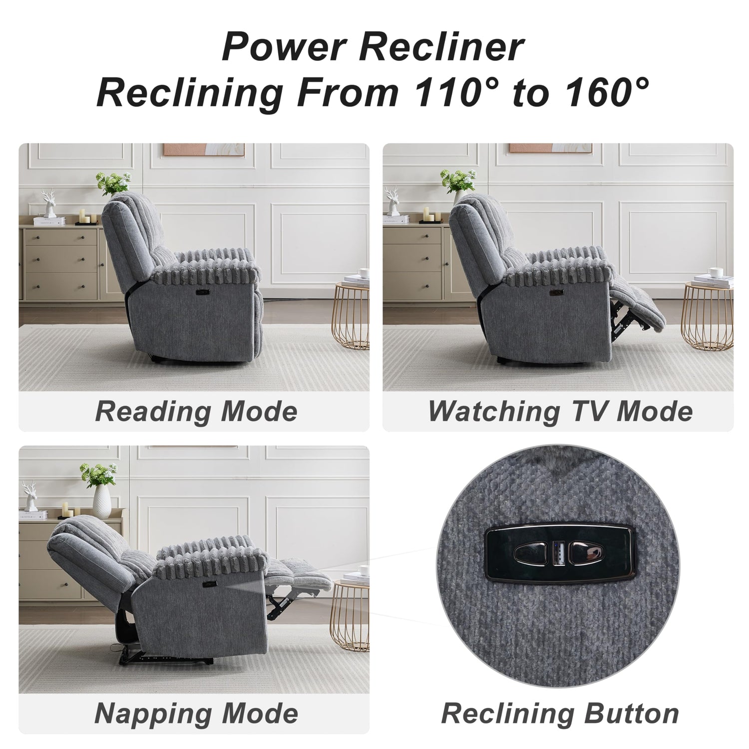 - 【Multifunctionality】: Equipped with a motorized reclining system, this oversized power recliner allows you to smoothly transition from a 90-degree upright position to a fully reclined 160-degree angle for maximum comfort. The leg rest can also elevate up to 90 degrees, giving you full control over your lounging position. Plus, it includes a conveniently placed USB port for charging your devices while you unwind.