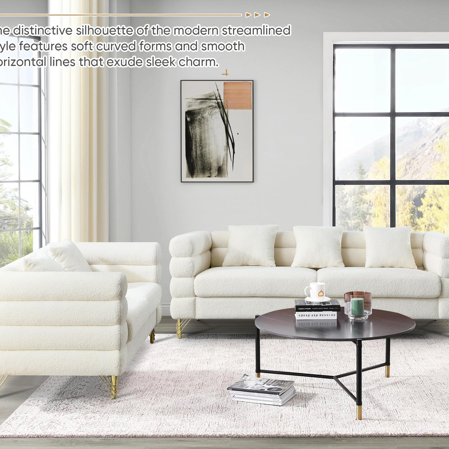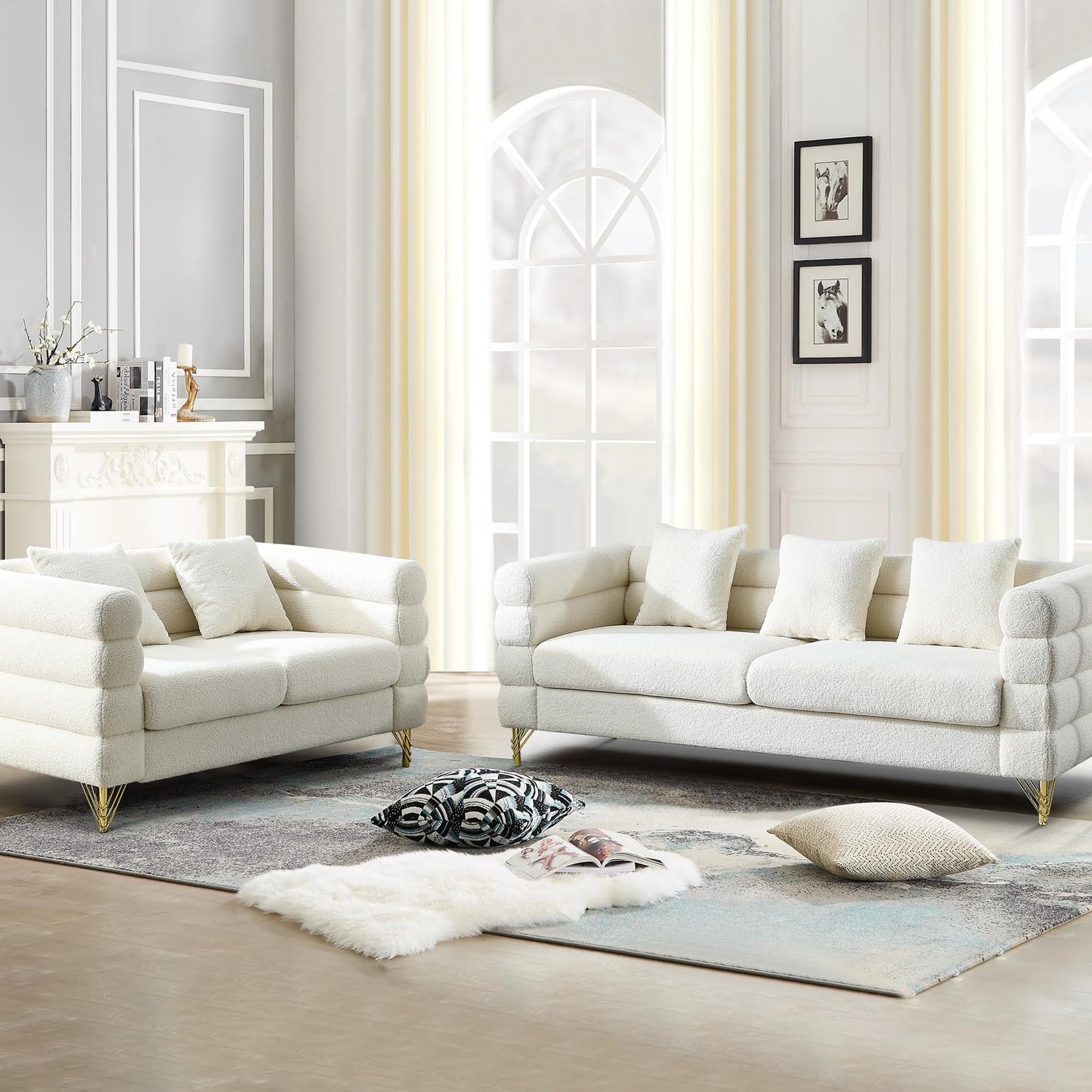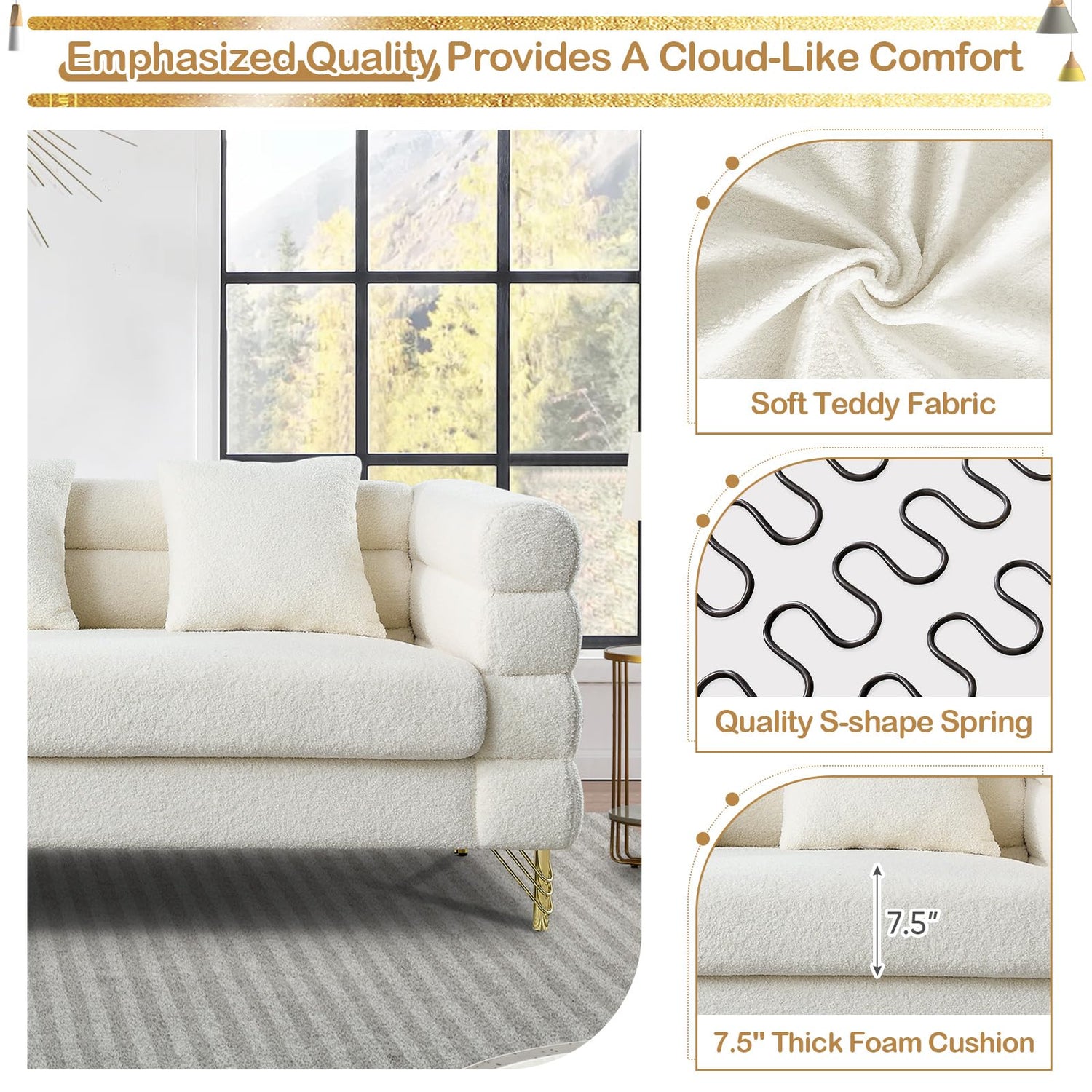 Comfy 3 Seater Sofa, 81-inch Oversized Boucle Couch with Deep Seat Design, Upholstered Sofa Couch with 2 Pillows, Modern Living Room Sofa with Stylish Metal Legs for Office, Waiting Room, White Teddy