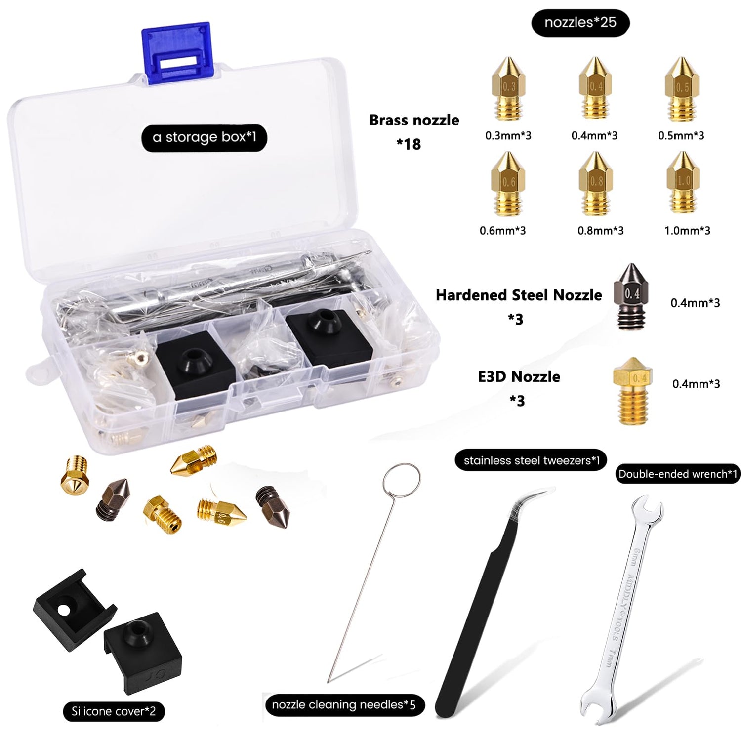 - Package List - The 3D printer extruder nozzles come with brass nozzles*18(0.3mm*3, 0.4mm*3, 0.5mm*3, 0.6mm*3, 0.8mm*3, 1.0mm*3), nozzles*3(0.4mm*3), and hardened nozzles*3(0.4mm*3), nozzle cleaning needles*5, silicone cover*2, hexagon wrench*1, stainless steel tweezers*1, and a storage box.