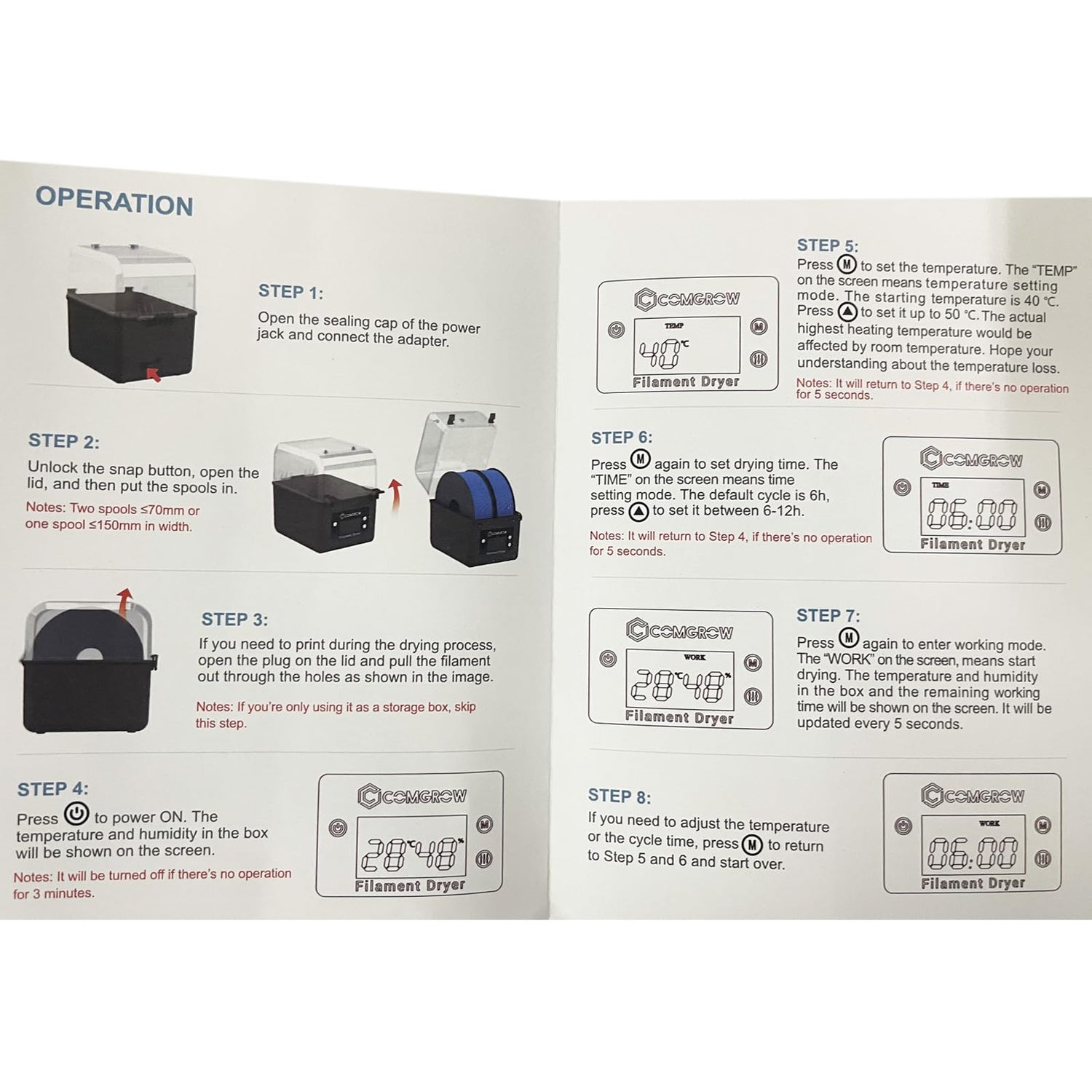 - Filament Dryer and Remove Moisture - Comgrow 3d printer filament dryer box is designed to keep filament dry and remove moisture from kinds of filaments. Internal heating during printing provides a dry storage environment for 3D printer filaments and keeps the filament dry. Avoid entanglement, clogging, poor adhesion, and layer migration caused by the dampness of the printing wire. (Note: Only used for the drying of 3D printer Filament)