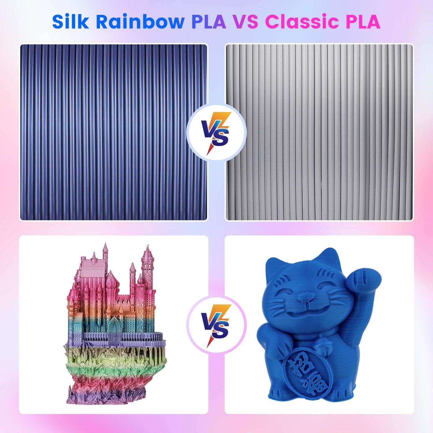 - Rainbow Colors Coextruded Filament-Different from the normal color change rainbow PLA filament, every inch of this magic 3d filament is made of rainbow colors. Silk glossy smooth appearance, Perfect for Arts, Crafts, and DIY 3D print projects.
