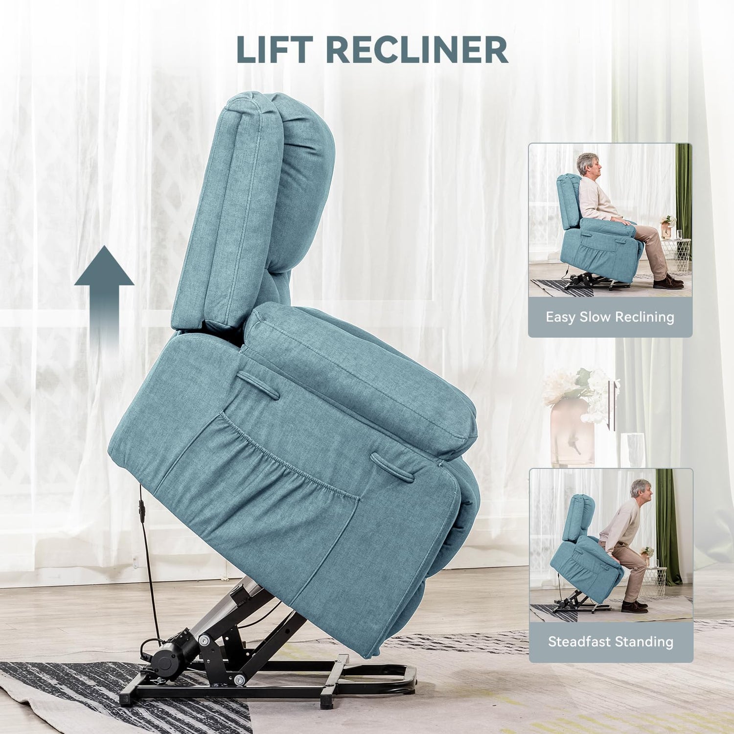 COMHOMA Electric Power Lift Chairs Recliners for Elderly,Recliner Chair with Massage and Heat,2 Side Pockets, Fabric(Blue)