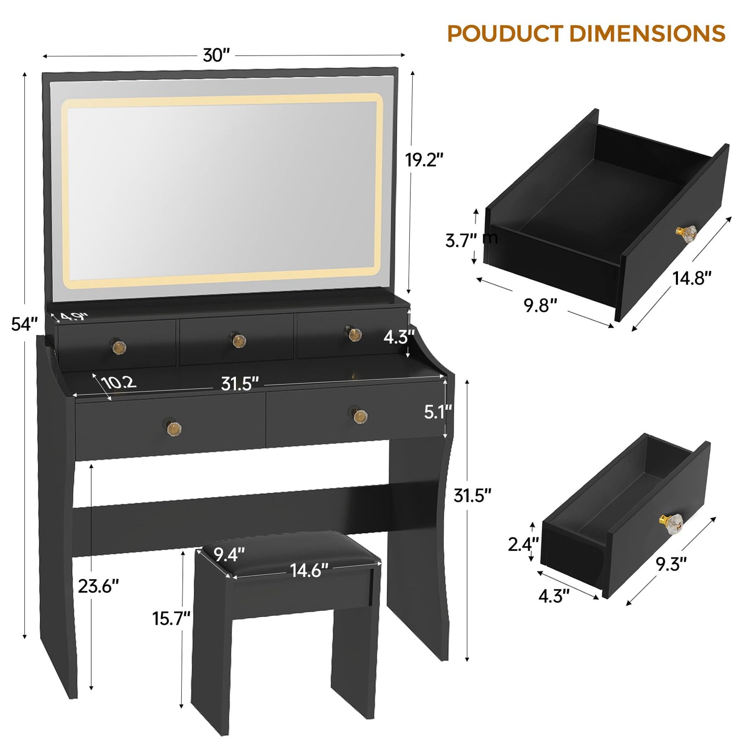 - Vanity with Large Storage Capacity - 5 Drawers of different sizes for you to store different types of belongs. What's special is the thickened top, which allows you to put some ornaments such as candles and succulent plants to decorate your room. Spacious desktop also brings you a comfortable work space