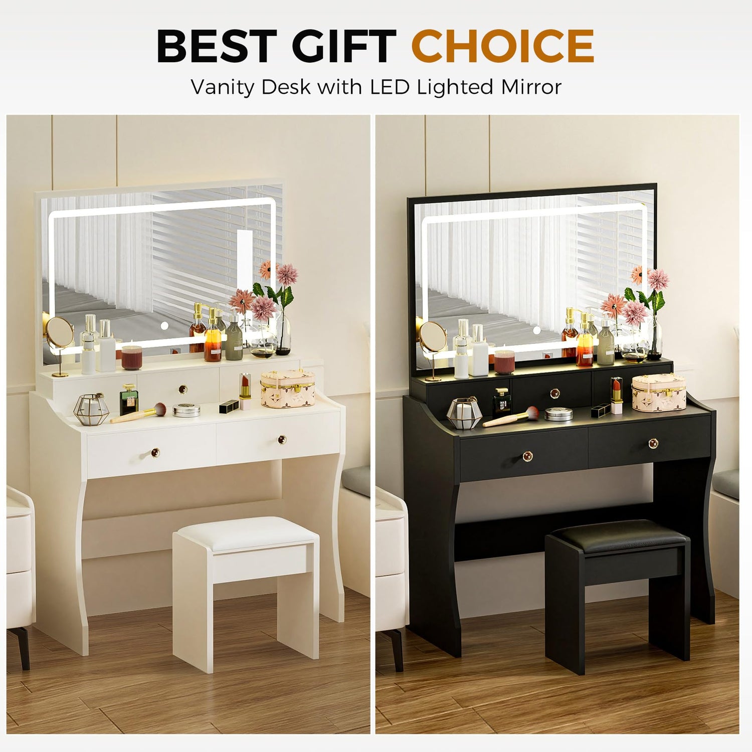 - Vanity Desk with Large Mirror - Our upgraded black makeup vanity features a wider rectangular mirror, providing a more comprehensive and complete field of view. The surrounded bulbs have 3 color options and the brightness can be adjusted (Cold white/Warm white/Warm yellow), catering to your lighting needs at daytime and nighttime