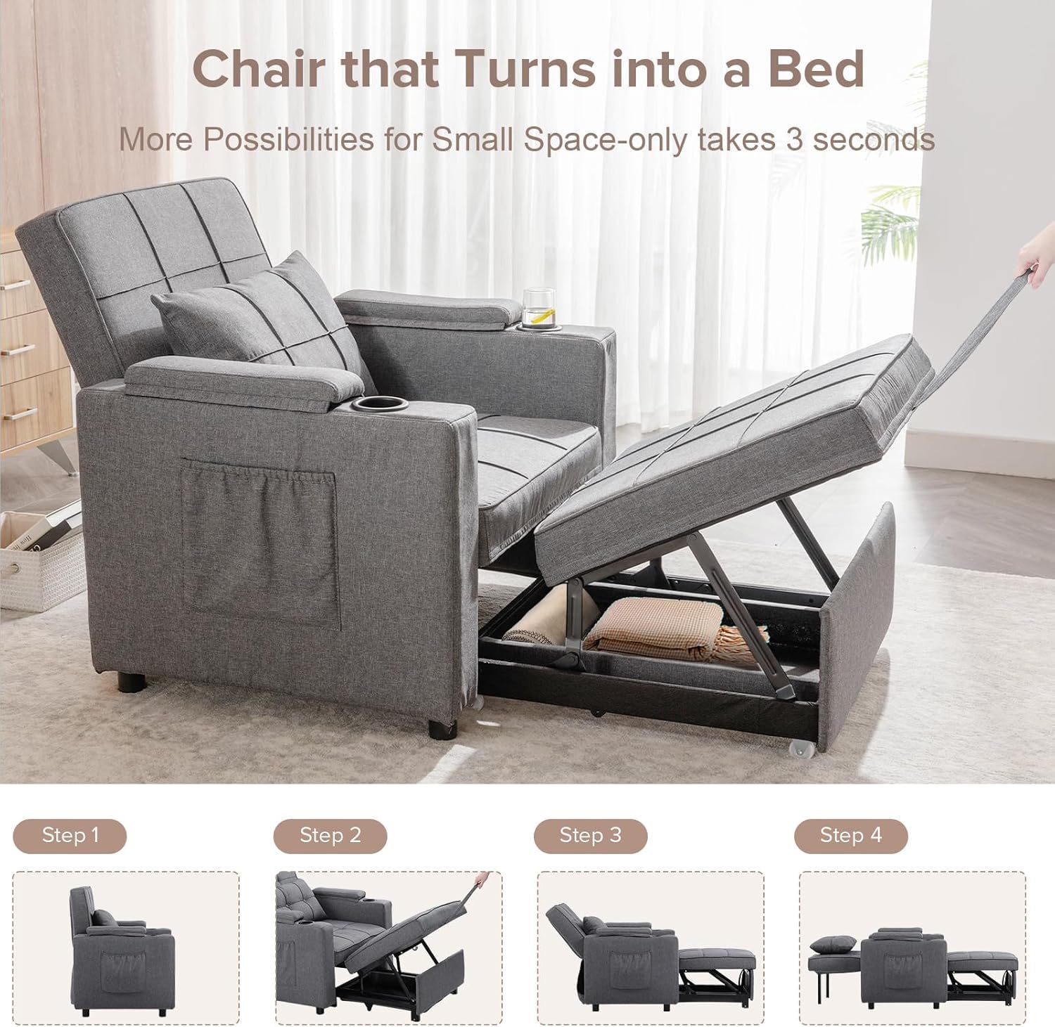 COMHOMA Sleeper Chair Bed,Convertible Sofa Bed Armchair with Cup Holders,3-in-1 Futon Bed Chair with Side Pocket Pull Out Sofa Bed Couch for Living Room,Bedroom (Grey)