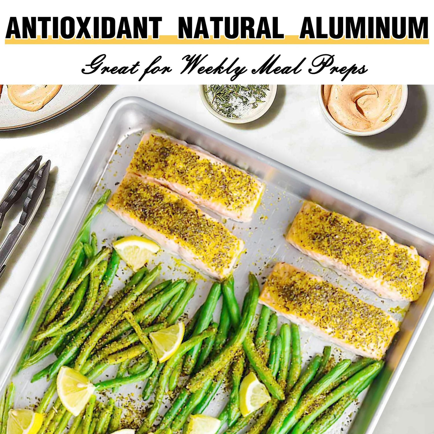 - PREMIUM EXTRA-GAUGE THICK ALUMINUM BAKING SHEET: The aluminum baking pans are made of thick and heavy aluminum, with a heavy rolled edge making this truly "commercial-grade". Pans are made of a special hardened aluminum alloy that provides maximized scratch resistance, making them long-lasting. These half-sheet pans will not peel or rust for a lifetime of durability. No reason to risk using non-stick chemicals for bakeware anymore