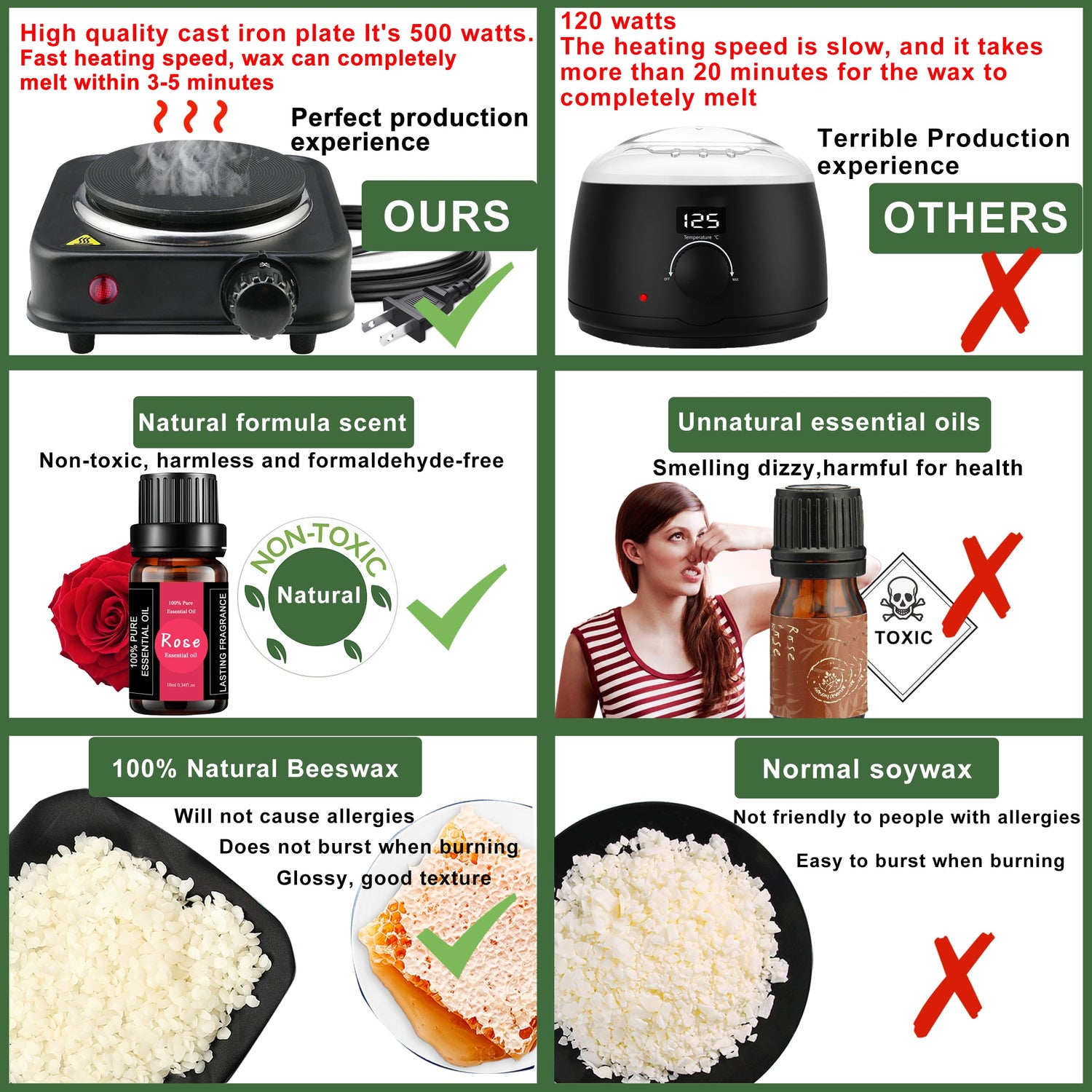 - 🎁Advanced Wax Material: Our candle making kit is made of 100% natural wax, the candle will not be easily deformed, cracked or melted, it can burn cleanly for a long time and effectively release the smell. No need to worry about the unhealthy chemicals found in traditional paraffin wax, we only use plant-based additives that naturally exist in the environment.