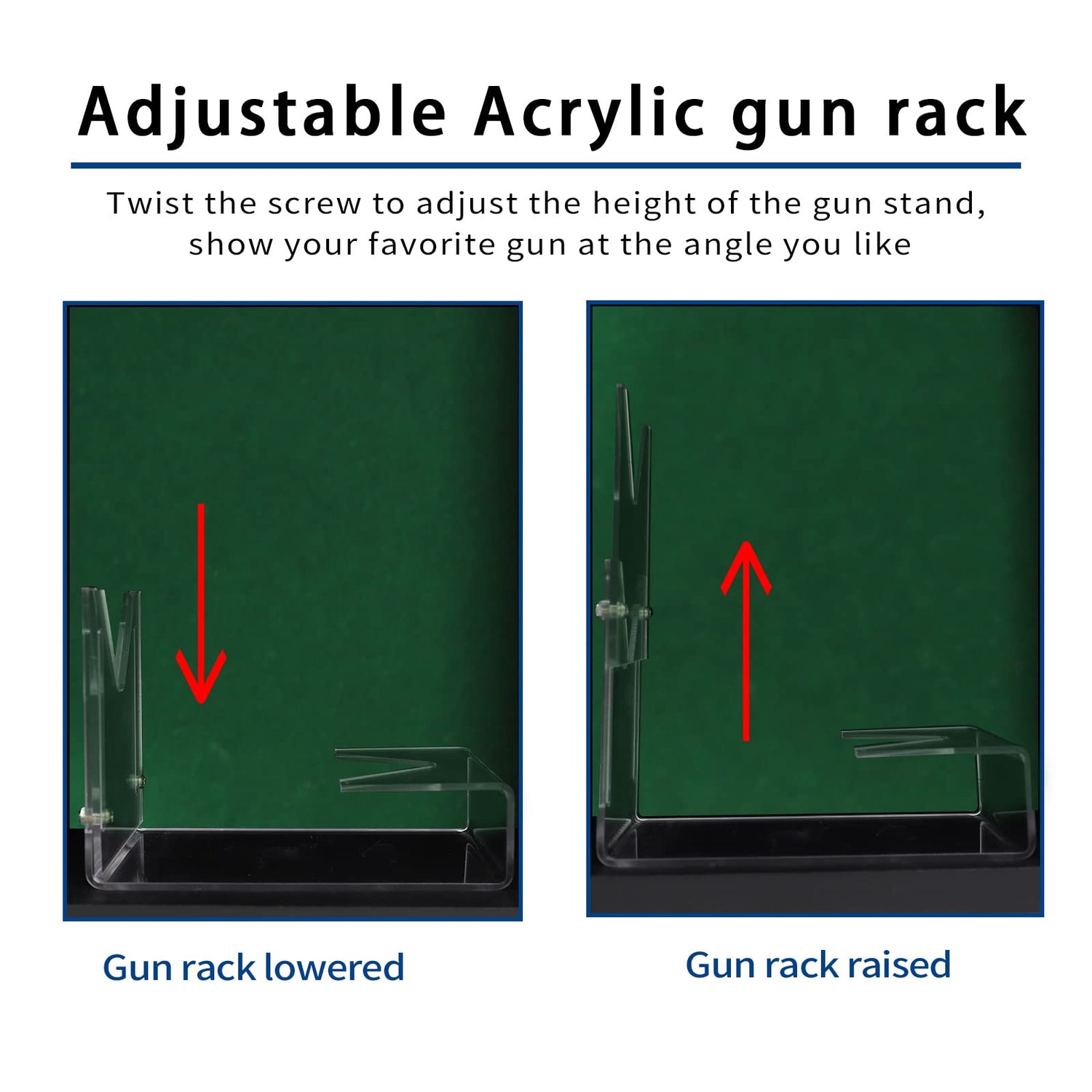 - ADJUSTABLE STAND: The acrylic stand is liftable and adjustable according to your needs! Can display 1 pistol, the appearance is polished and looks very high-end; black velvet background is very luxurious; size: 13.6X8.85X4.72""D, weight: 3.21 pounds (excluding gun)