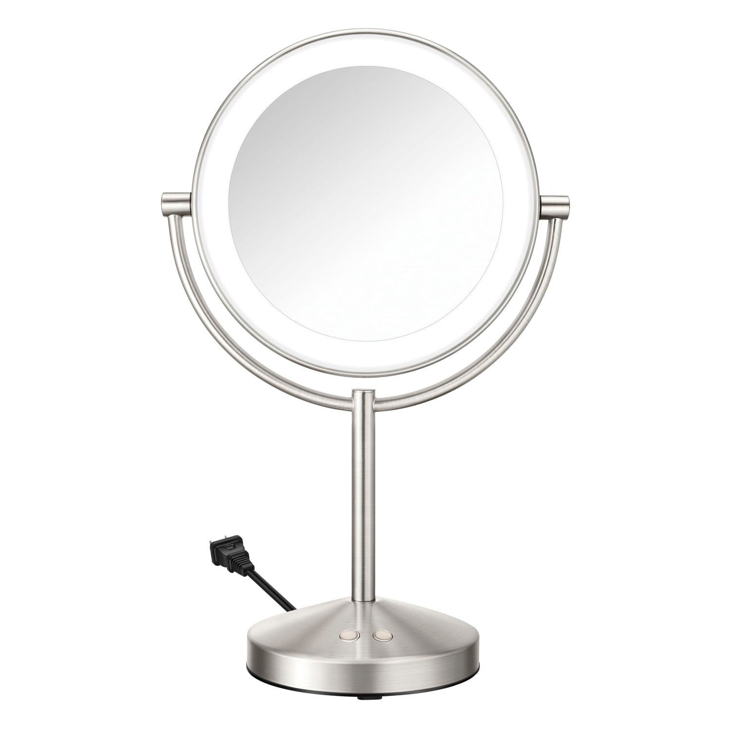 Details: Manage your mirror’s magnification with the double-sided mirror that’s easy to position for a custom reflection. Simply flip the 8.5-inch diameter round mirror from 1x magnification to 10x magnification or rotate it 360° for custom viewing at any angle. Mounted on a swivel display with a no-slip, no-tip weighted base, the mirror is illuminated with lifetime LED lighting that never needs to be replaced. Choose from 3 light modes (office, home, or day) and 3 settings (low, medium, or high) to customize the light depending on your location, time of day, and beauty needs. The satin nickel finish gives this must-have mirror a sleek, modern look that complements any vanity.