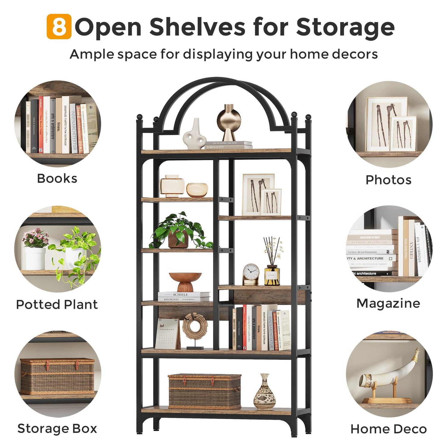 Condemo 71 inch Tall Bookshelf, 8-Tier Industrial Arched Etagere Bookcase, Open Display Storage Shelf for Living Room, Bedroom, Home Office, Rustic Brown