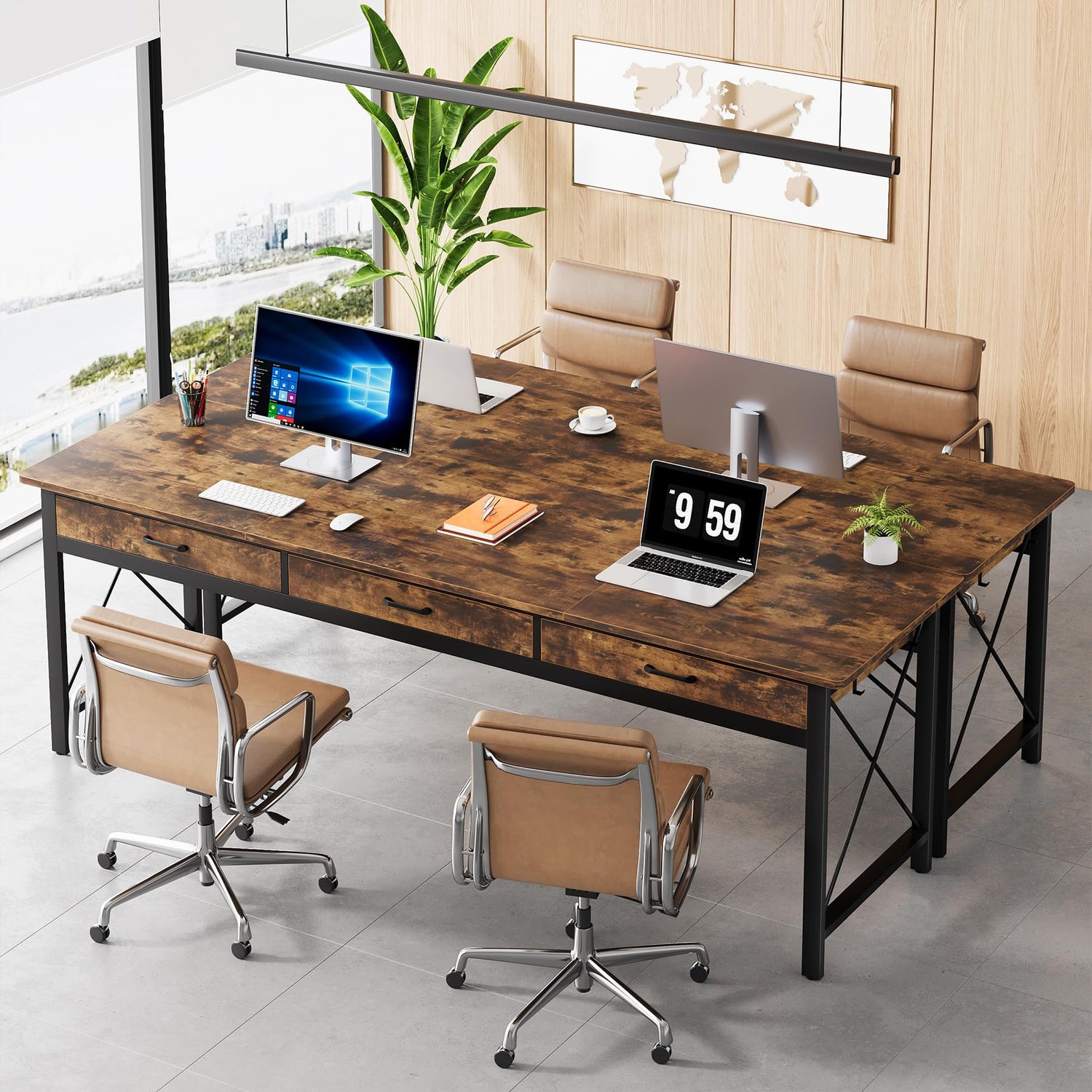 Condemo 78.7 inch Extra Long Computer Desk, Two Person Desk with 3 Drawers, Double Desk with Hooks, Industrial Writing Study Table Workstation for Home Office, Rustic Brown and Black