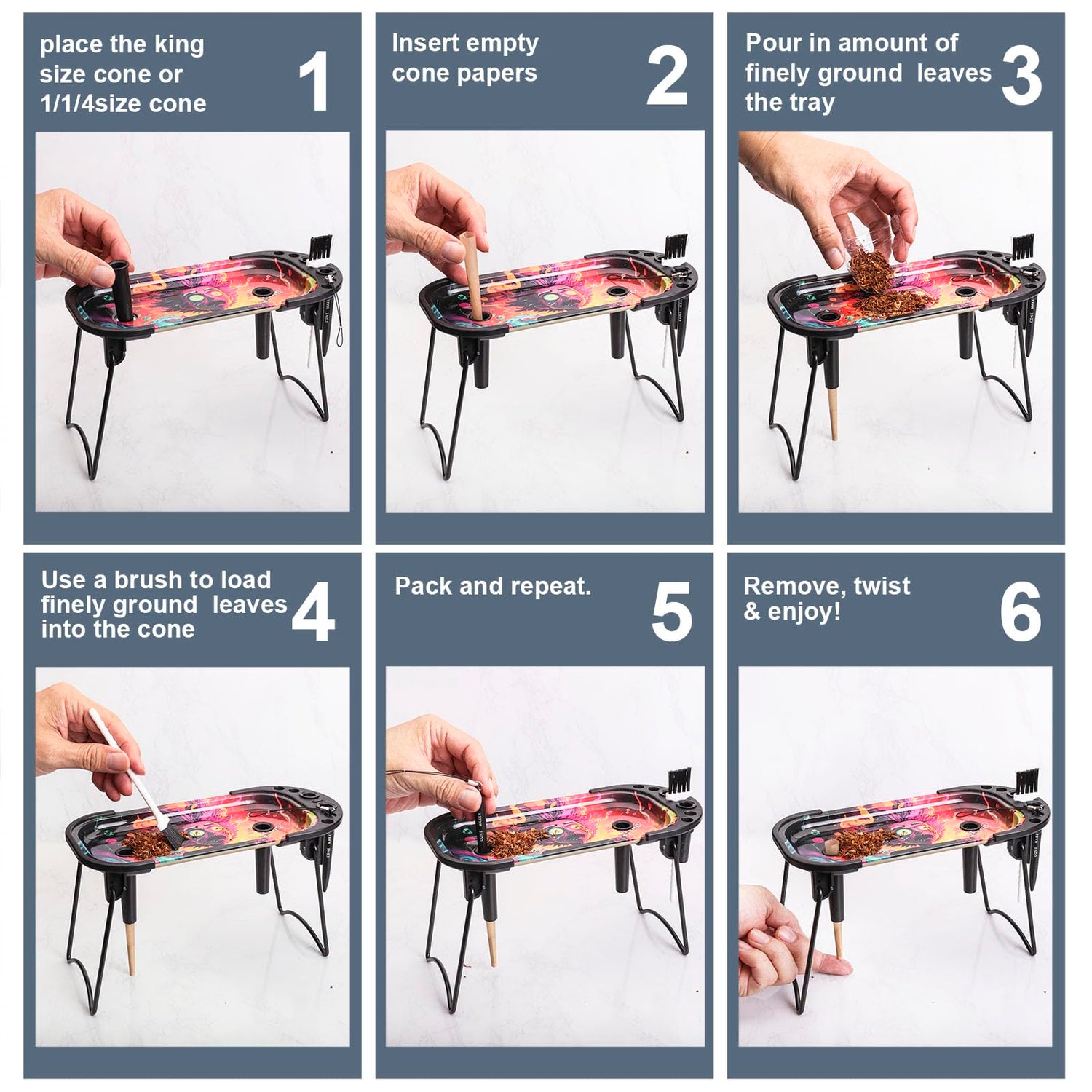 - Pre-Rolling Cone Loader:including foldable stand metal rolling tray cone loader,cone funnel,cone maker,taper grove conver and brush.