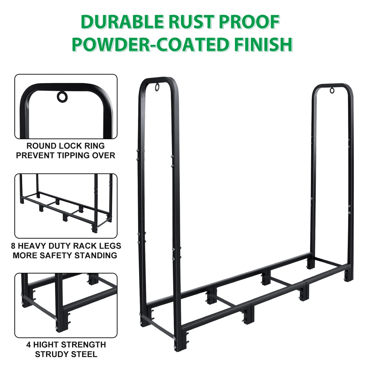 - 🔥 Well-strudy & Sustained- 8 SUPPORT SOLID LEGS keep all things stable reliably,our firewood storage rack holds and stores up to 1/4 face cord of firewood, easily withstand a load up to 2550lbs. 2 anti-tip lock rings of fire wood log rack makes it is more substantial, in case of tipping over the heavy firewood, just lock up the rack with extra anti-tip straps.