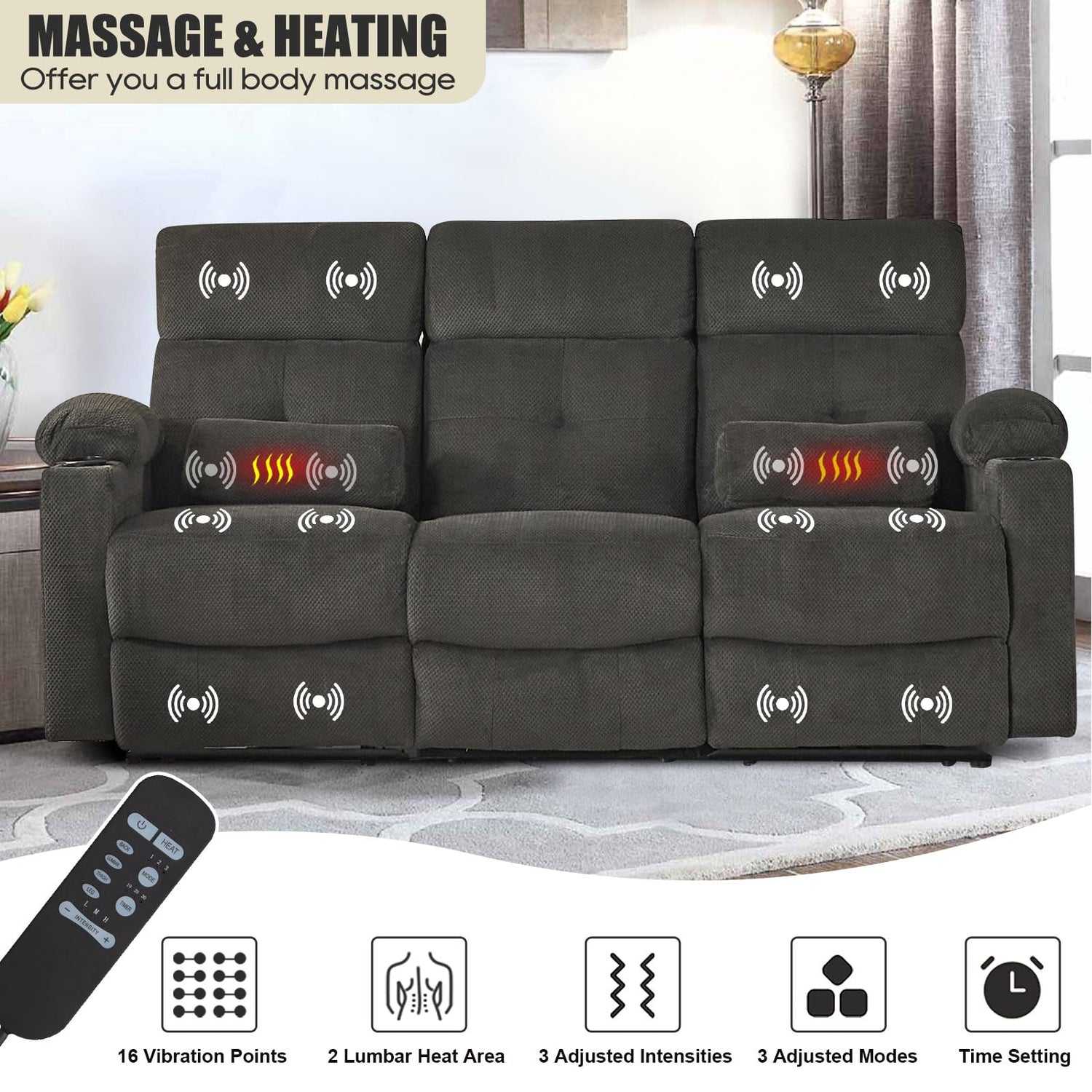 - Massage & Lumbar Heating: The seats on both sides of this recliner sofa 3 seater can be massaged and heated, and can be controlled separately. Each side has 8 vibration points, 3 intensities, 3 modes, and 3 times to choose, allowing you to customize the most suitable combination to relieve muscle pain and atrophy. The addition lumbar heating function can further promote blood circulation. By the way, it has self-protection settings, it will automatically power off after 10 minutes or 15 minutes of use