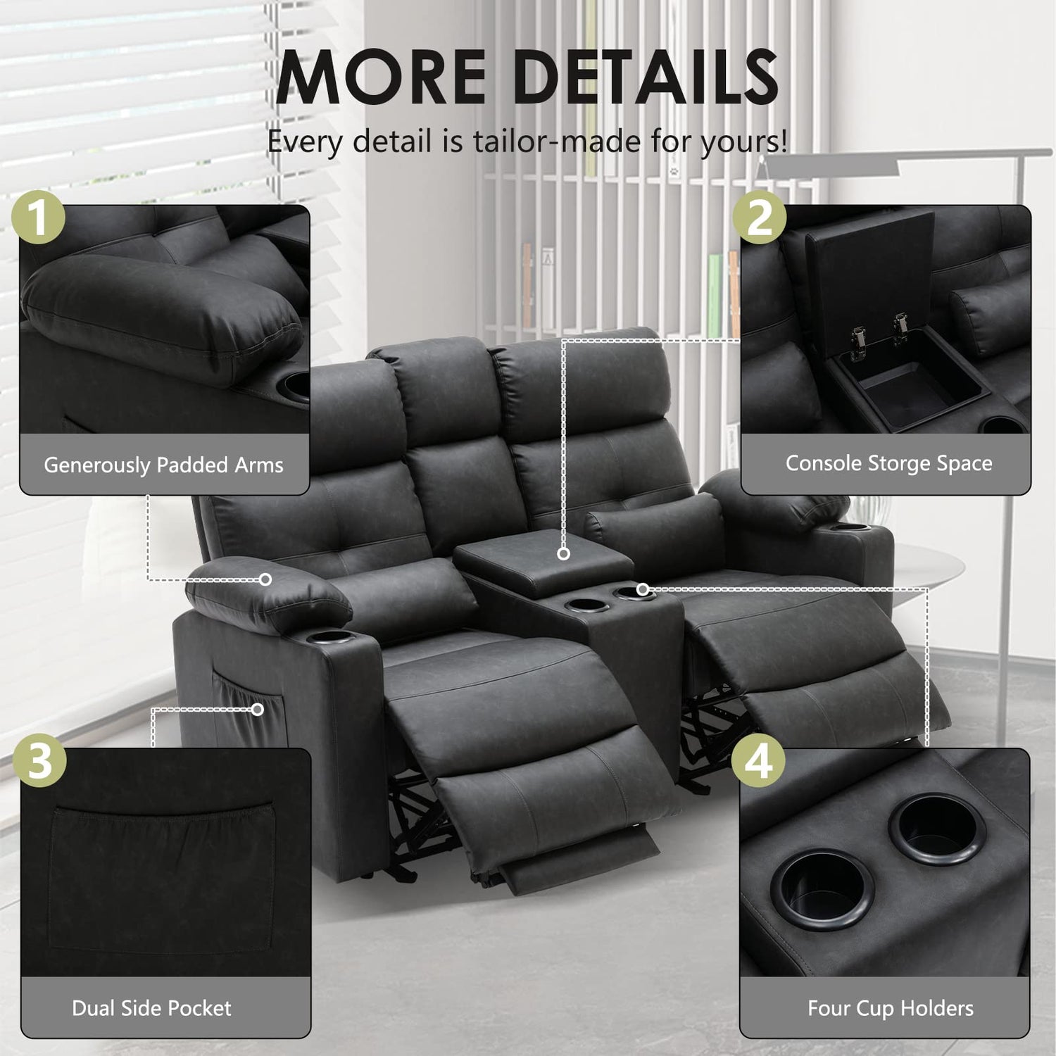 - Comfort & Multy-Function: The power reclining loveseat has a center console with a depth of approximately 4.7'', can hold your glasses as well as things like your reading magazines. Two side pockets give you a more convenient way to store your phone or other small items. At the same time, there are four cup holders, which are convenient for you to store drinks or cups. The thick headrest, backrest and armrests are wrapped with baby velvet, which is softer, less prone to pilling, won't deform