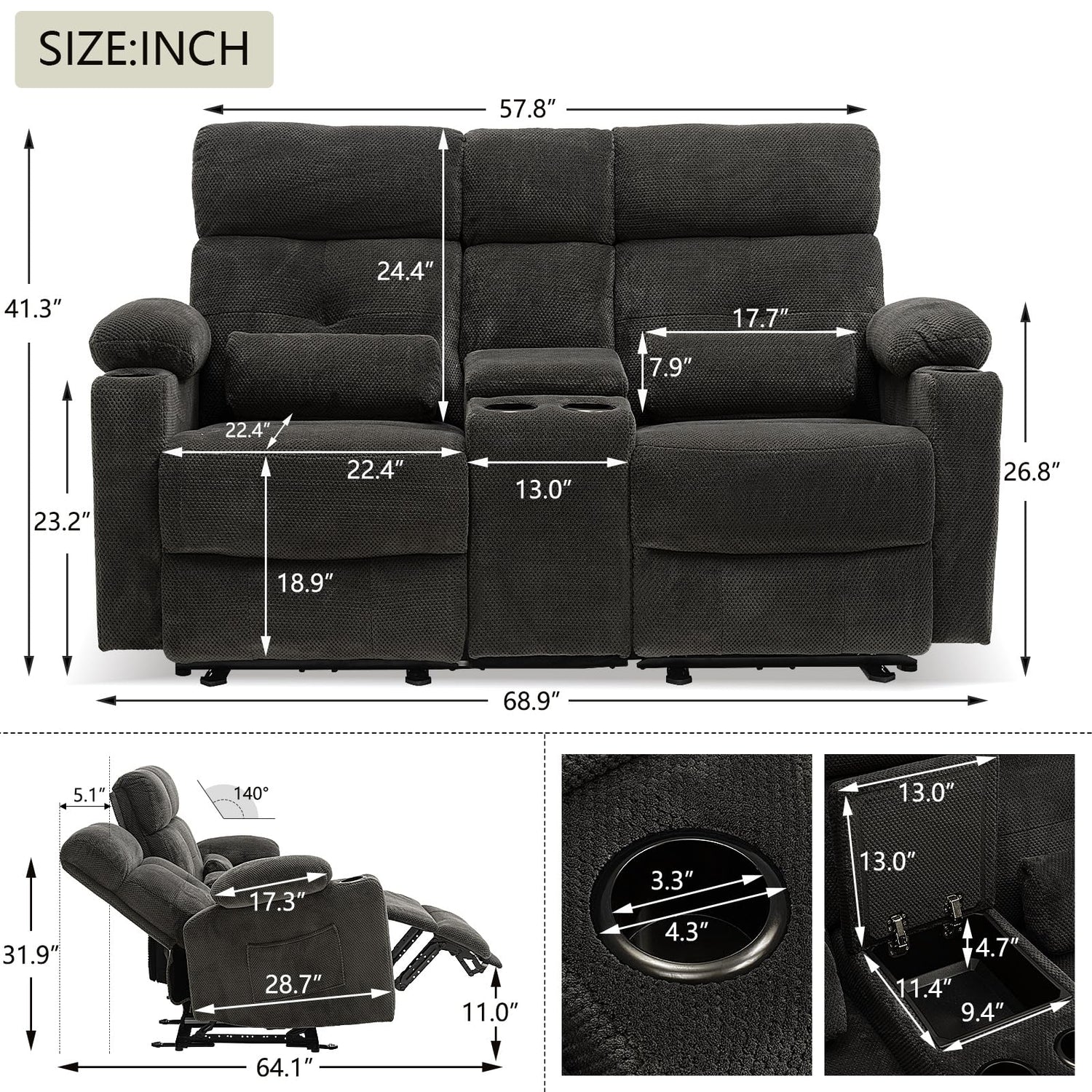 - Comfort & Multy-Function: The power loveseat recliner has a center console with a depth of approximately 4.7'', can hold your glasses as well as things like your reading magazines. Two side pockets give you a more convenient way to store your phone or other small items. At the same time, there are four cup holders, which are convenient for you to store drinks or cups. The thick headrest, backrest and armrests are wrapped with baby velvet, which is softer, less prone to pilling, won't deform