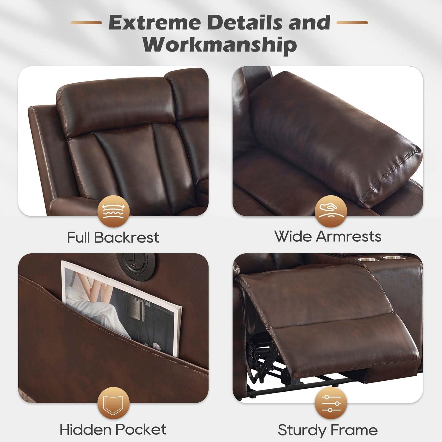 - Multiple Ports: Each side of the loveseat recliner is equipped with Type-C and USB port, so you can charge your low-power devices (such as mobile phones and pads) without leaving the recliner loveseat. Fully Enjoy the convenience of this double recliner