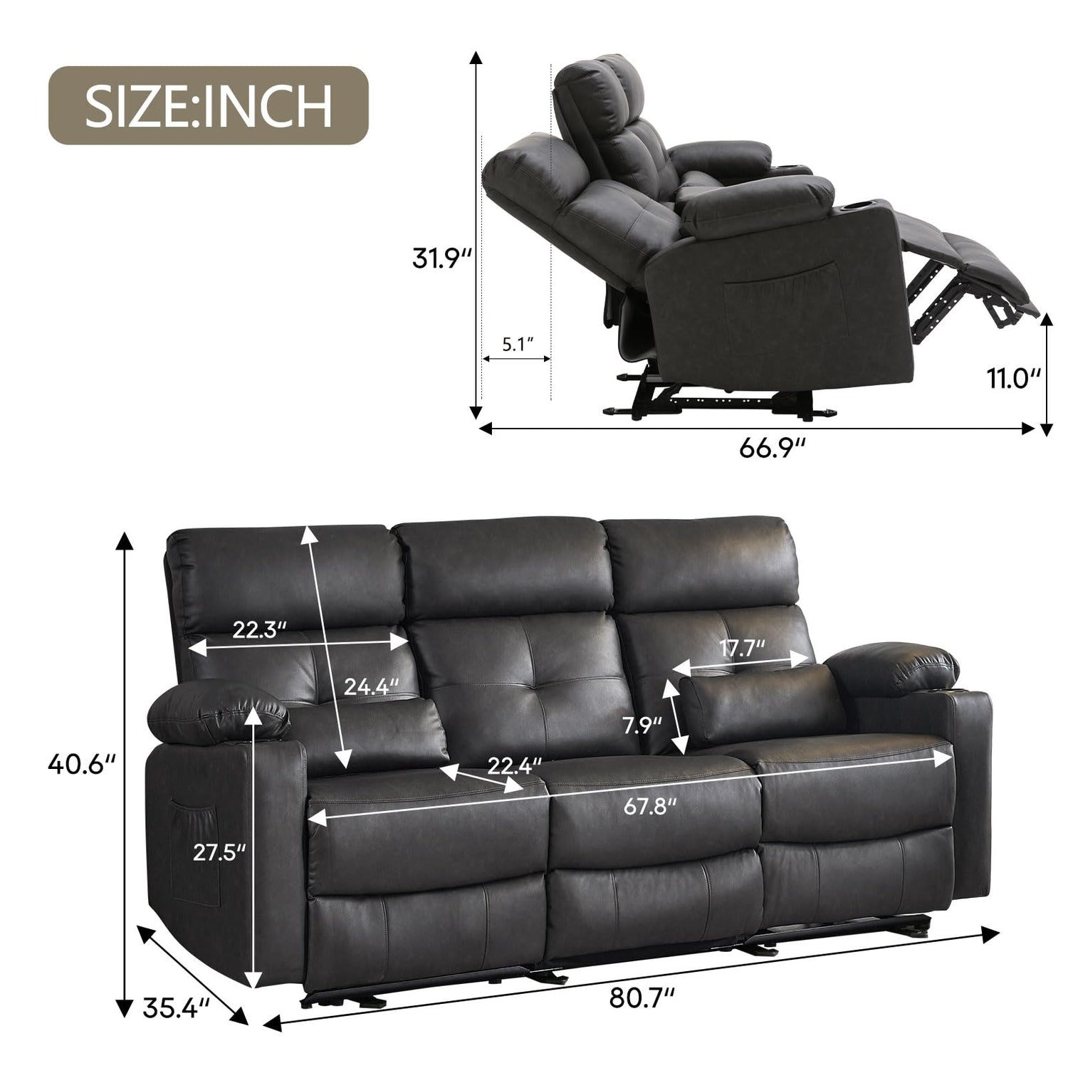 - Convenient Design & Material: The power reclining couch is wrapped in high quality PU leather, which is wear-resistant, breathable, skin-friendly and very easy to maintain. There are also two large pockets and cup holders on both sides for added storage space and easy access, allowing you to fully enjoy the convenience and comfort that this power recliner sofa brings, In addition, seats on both sides are equipped with a lumbar pillow to provide strong support for your lumbar area