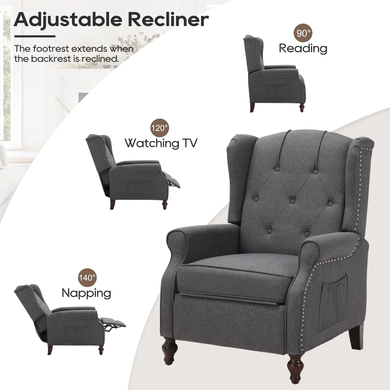 - Easily Push Back Recliner: After a tiring day at work, just go home and relax on the wingback recliner chair! Push back to lie down easily, the backrest can be reclined 90 to 140 degrees, and the footrest will pop out to provide your feet a comfortable location. Simply press the footrest down with your feet and the wingback recliner will return to its original shape