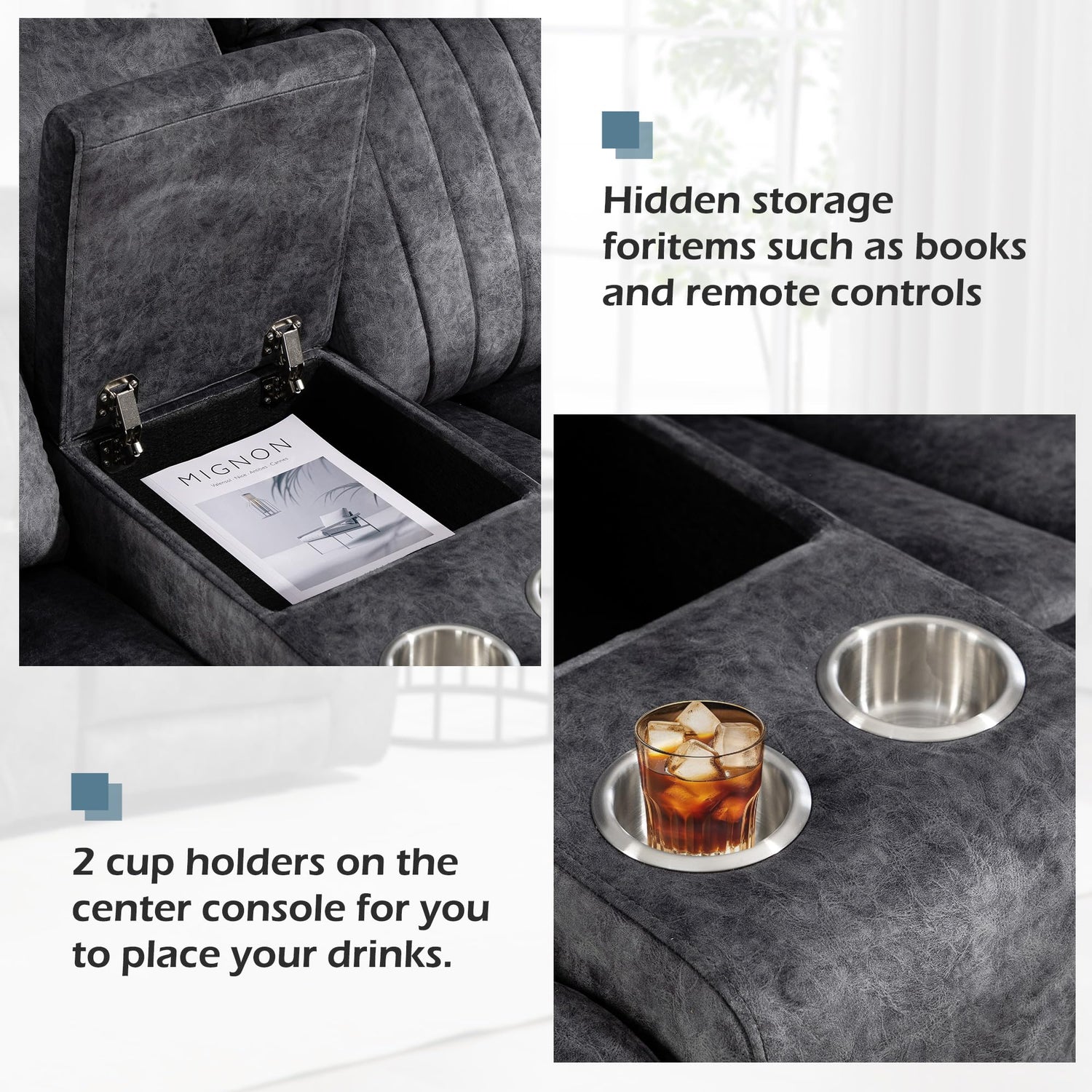 - Reclining Loveseat with Console: This wall hugger loveseat recliner has a hidden center console with a depth of about 4.7 inches, which can hold your glasses and reading magazines. With two cup holders, so you can enjoy your favorite drinks and popcorn while enjoying your favorite movies or shows, ensuring that your drinks are always within reach without interrupting your relaxation time. These clever designs not only increase the practicality of the power reclining loveseat, but also enhance the overall comfort experience, making every moment more comfortable and convenient