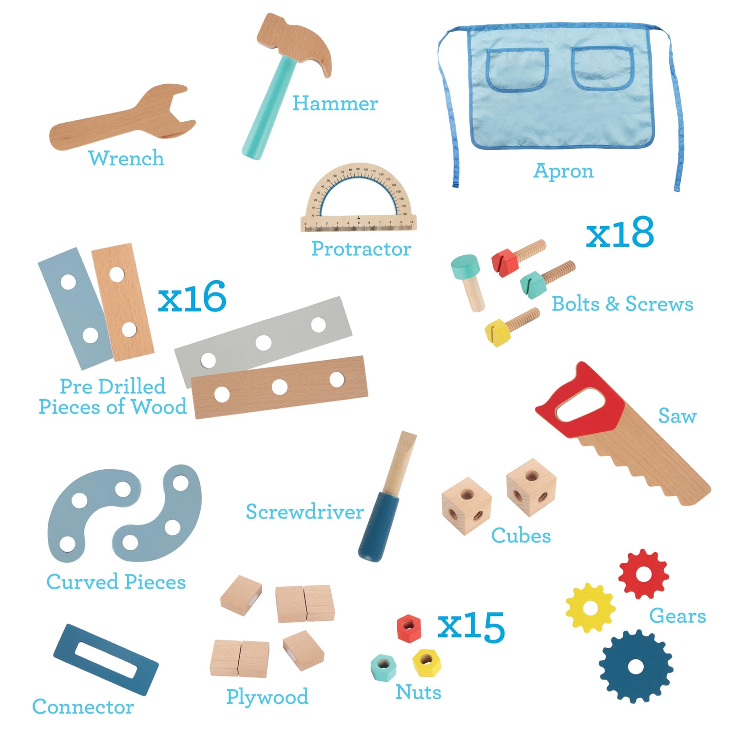 - Contents include: Work apron, hammer, saw, wrench, screwdriver, protractor, 18 bolts & screws, 16 pre drilled pieces of wood, 2 pieces of plywood, 2 cubes, 2 curved pieces, 15 nuts and 3 gears. Also includes a spinning turn saw, plywood with velcro to saw apart, a storage drawer and steering wheel