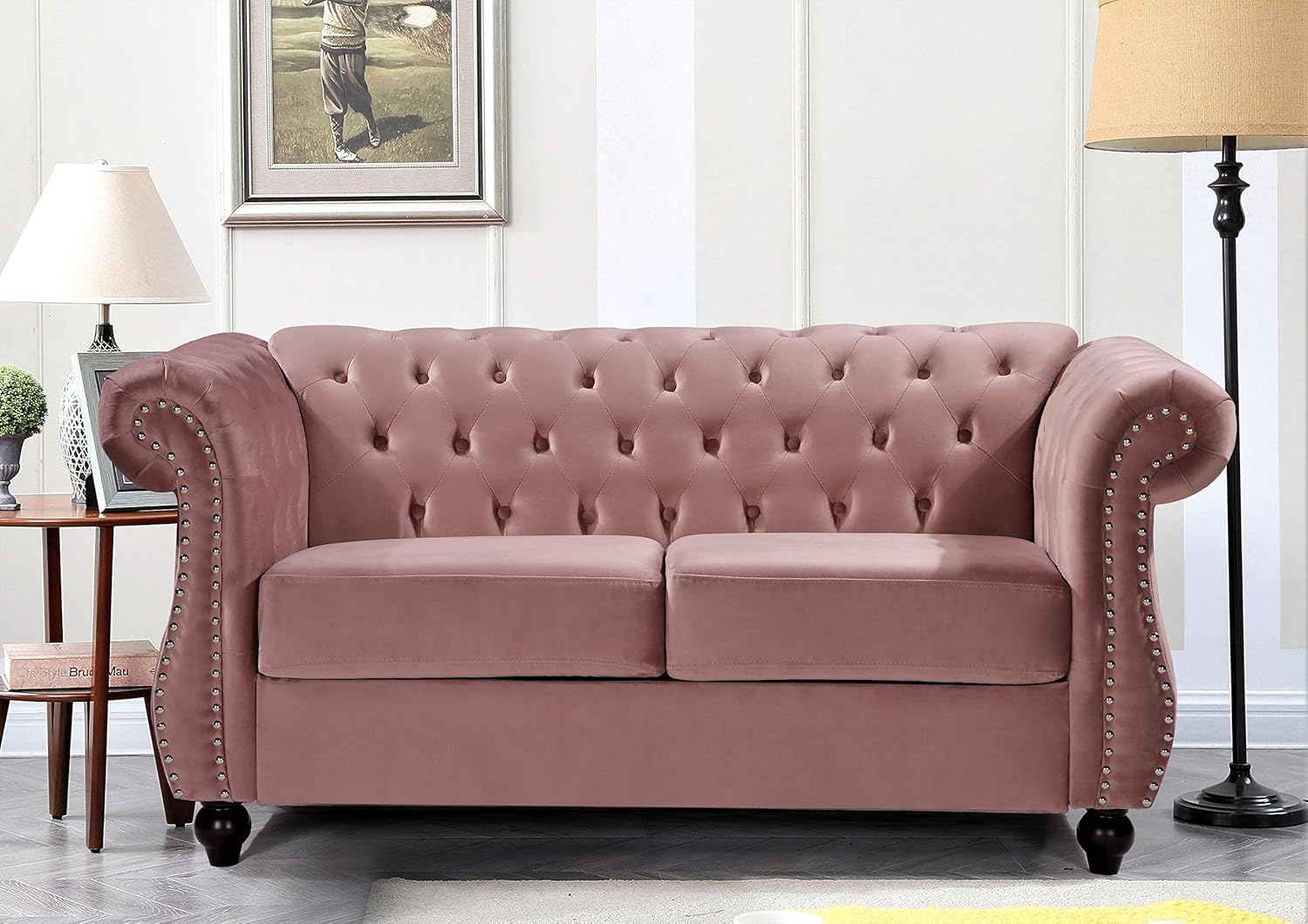 Container Furniture Direct Feinstein Modern Velvet Chesterfield Couches for Living Room with Nailheads, Diamond Tufting & Durable Metal Frame, Loveseat, Rose