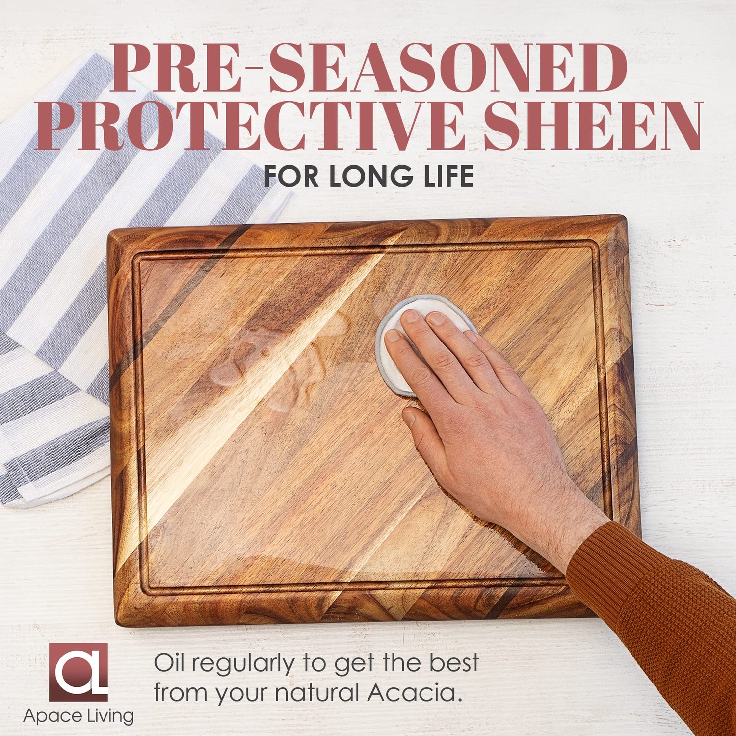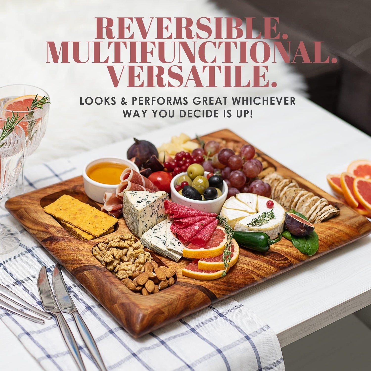 - INNOVATIVE REVERSIBLE DESIGN MAKES CHOPPING AND SERVING A BREEZE: Every kitchen thrives on practical and alluring accessories that bring your best home cooking to the table. This extra large, functional and stylish Acacia cutting board makes your food prep easy as pie because its generous platter handles all the meat, cheese, vegetables and fruit you’ll ever need to slice and dice. When your food is prepared, your board flips over and works as a practical and attractive serving tray.
