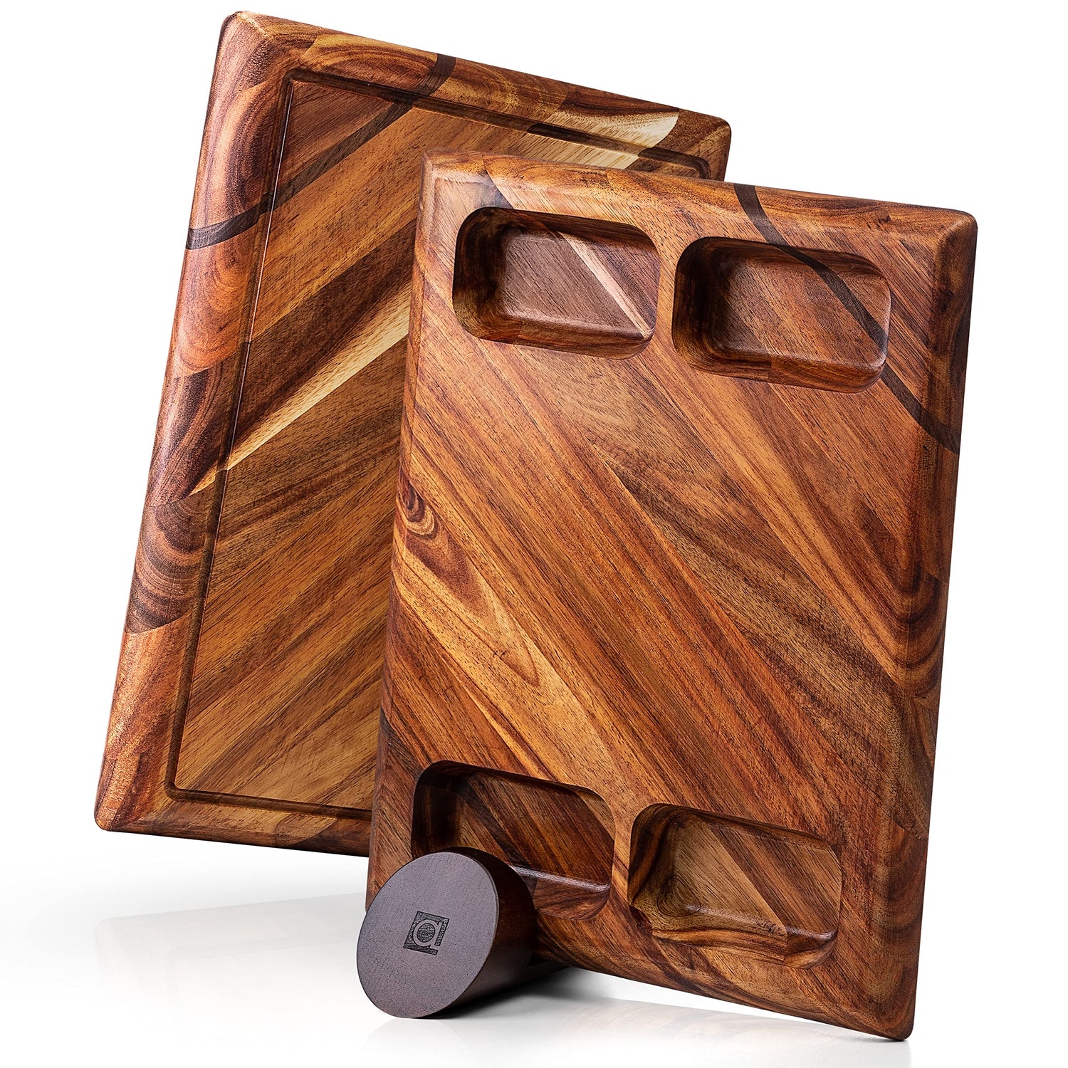 Contour Wood Cutting Board - Large Acacia Butcher Block Chopping Board for Kitchen w/Stand, Sustainable Wood, Juice Groove - Doubles as 4 Compartment