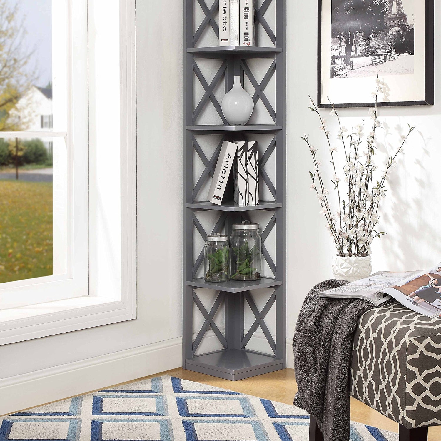 - SPACIOUS SHELVING: With five tiers of spacious corner shelving, this modern piece offers much storage space for your books, plants, media, collections, and decorative items!