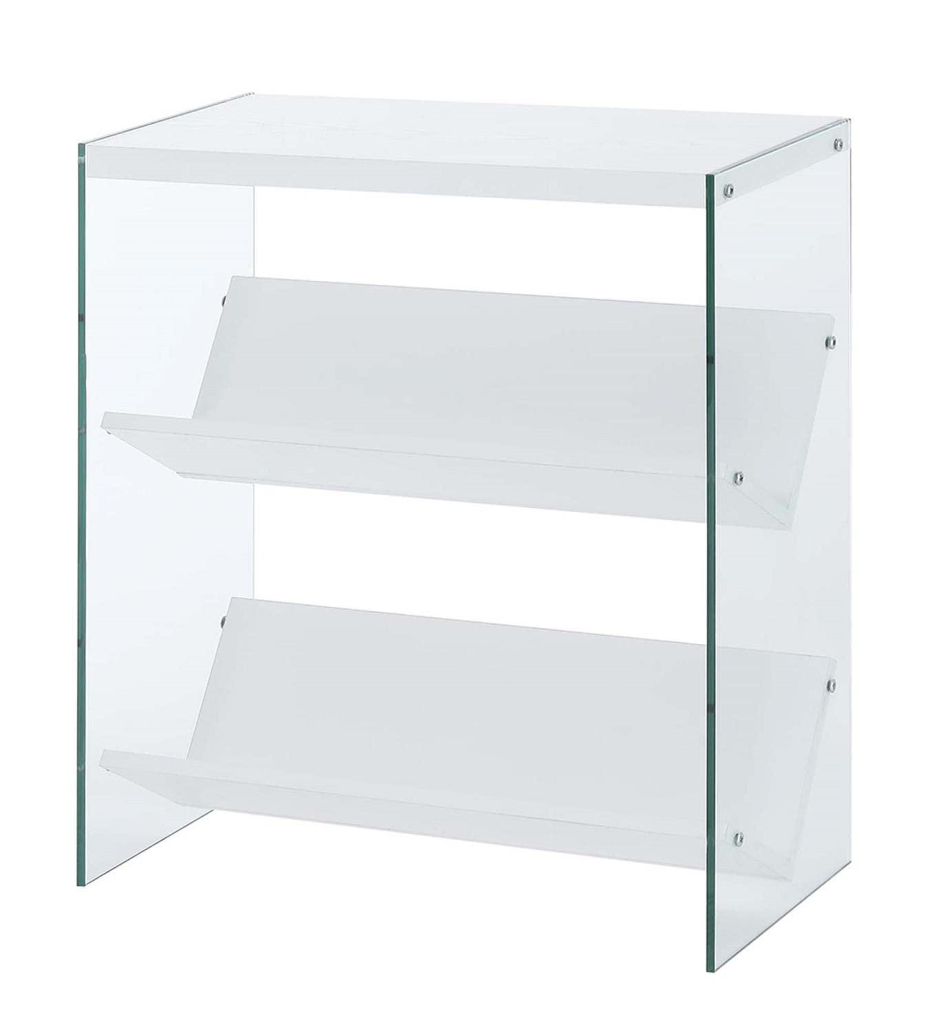 Details: Get in the Orbit of the Soho bookcase that is perfect for any modern space. With a generous white top surface, you'll have plenty of space to store your decor Or pictures. The tempered glass sides catches the eye and makes this bookcase a sparkling addition in any room. This decorative yet practical piece has a convenient stylish two lower shelves for plenty of added display and storage. Will provide years of enjoyment.