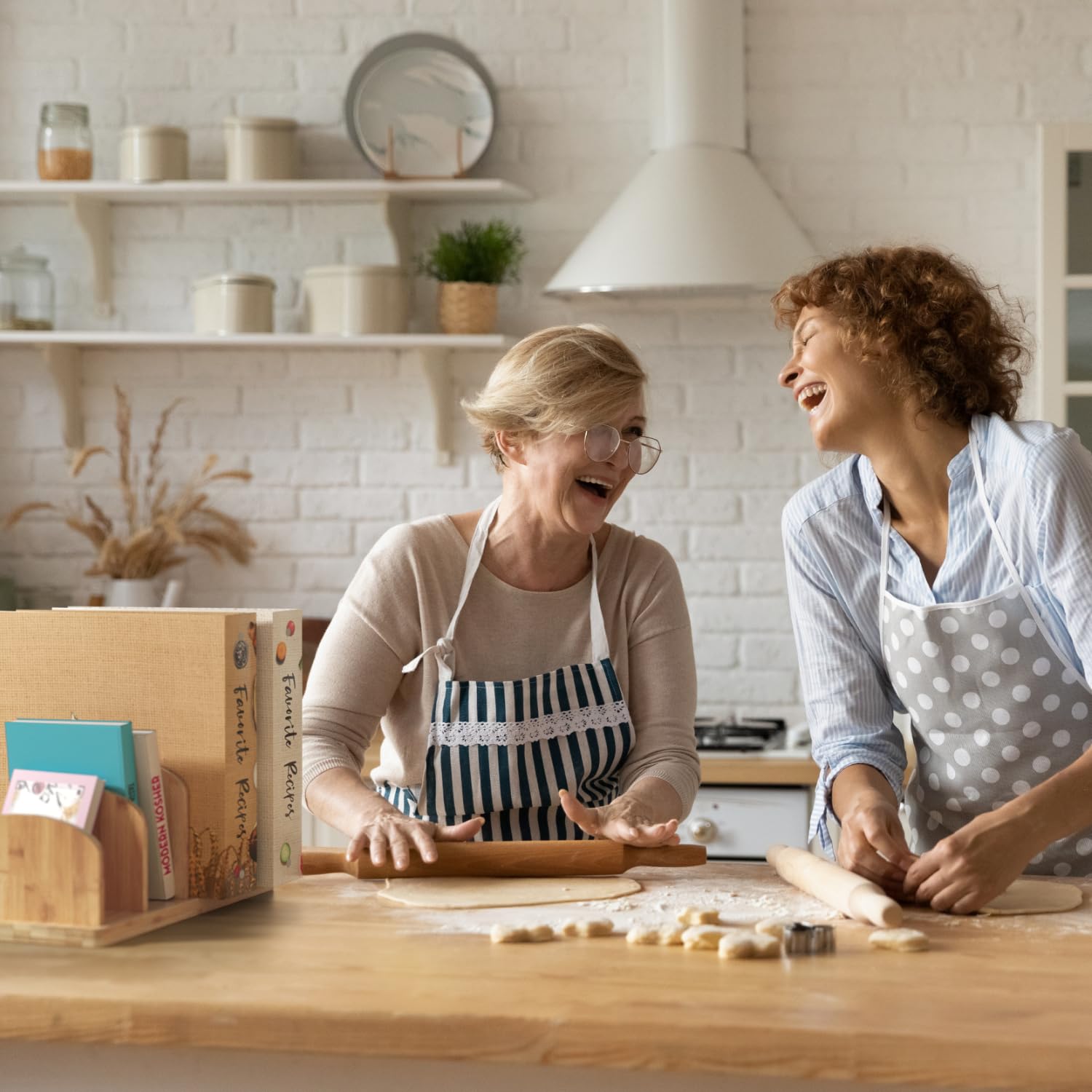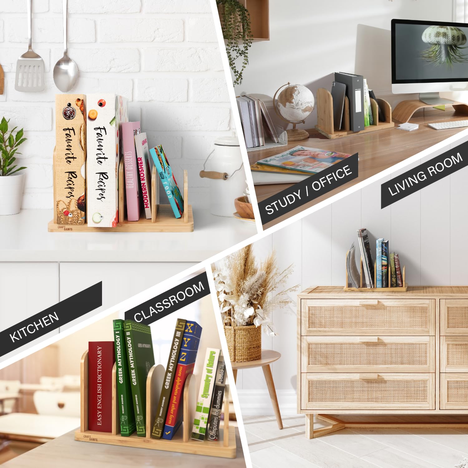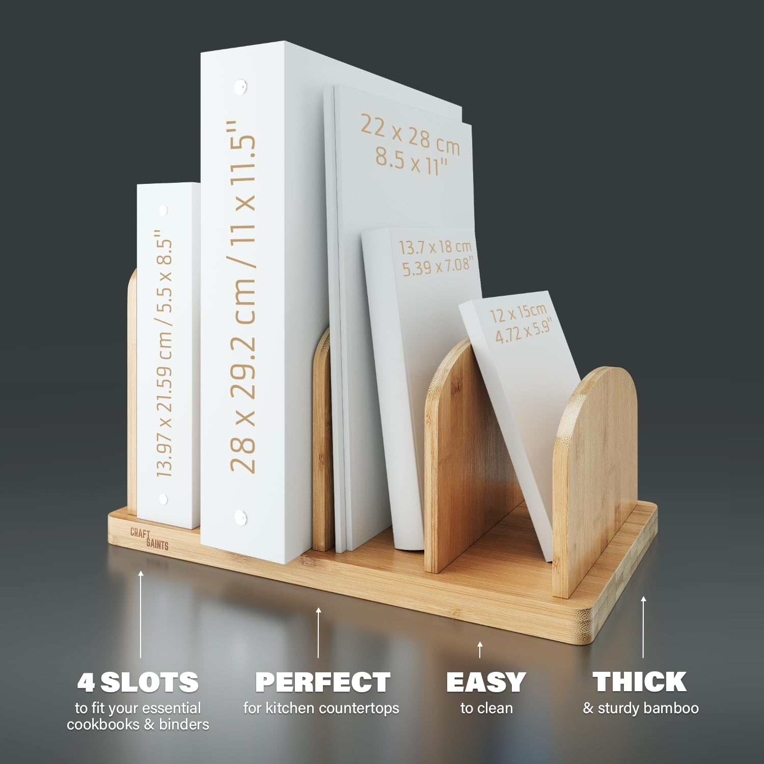 - CONVENIENT KITCHEN COMPANION - The bamboo kitchen countertop cook book organizer features four 2.36'' slots, providing ample space to store your cookbooks, recipe cards, recipe binders & other essentials. With this desktop bookshelf, you can keep everything within reach, saving valuable countertop space and making cooking more efficient. Beautiful bamboo aesthetic combined with a practical overall design makes our mini bookshelf the perfect kitchen companion.