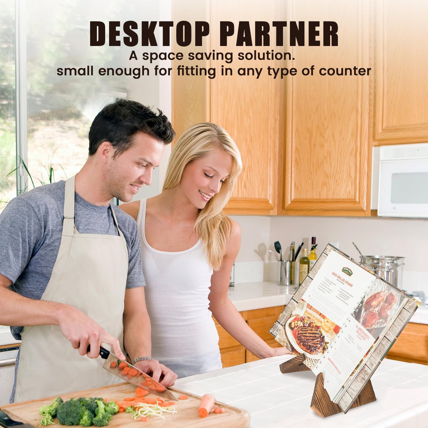 - Clever Design: The cookbook holder is made of natural and high-quality solid wood, which is lighter and sturdier than bamboo. The wood is carbonized to show a beautiful and clear wood grain; all edges are smooth and comfortable through finely sanded. The extended bottom length allows you to adjust a comfortable reading angle and does not hinder page turning.