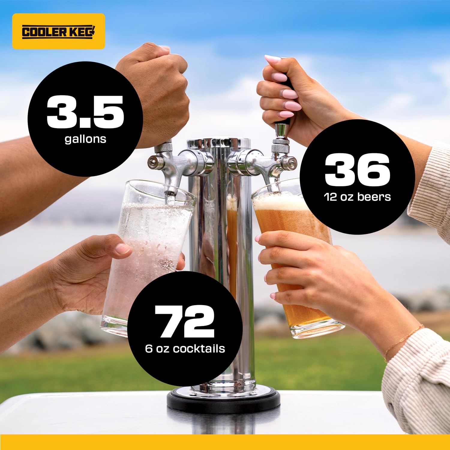 - CAPACITY FOR A CROWD: The Cooler Keg system holds 3.5 gallons in total. That means with both kegs filled, you can serve 36 twelve oz beers, 72 six oz drinks, or 144 three oz cocktails. Not enough? We also sell extra kegs that you can switch out during the party.