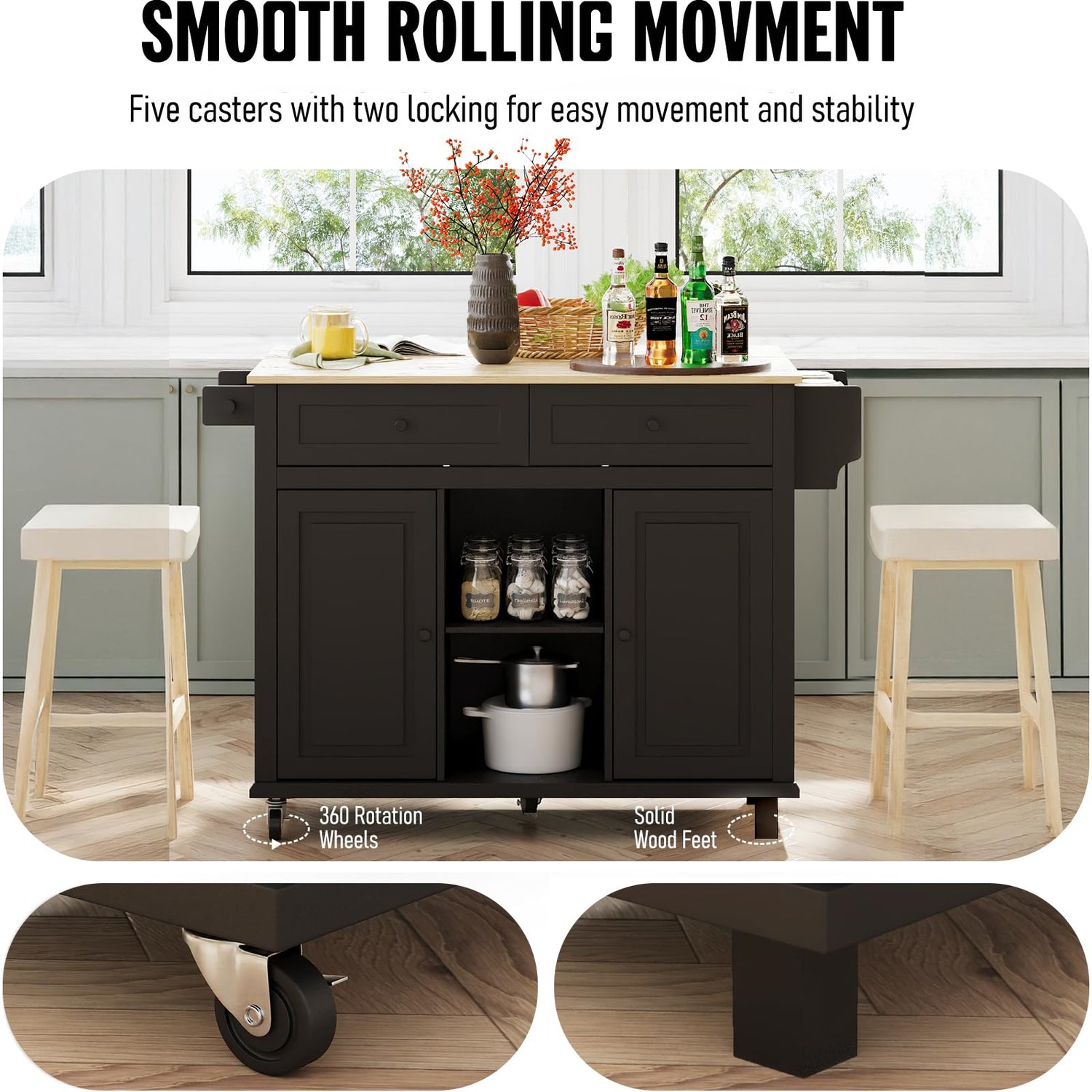 - [Sturdy Bamboo Top] This rolling kitchen island features a beautiful bamboo top, combining durability with elegance. The sturdy frame and durable materials provide lasting support, while the modern design adds style to your kitchen or dining area. With dimensions of 29.5”D x 53”W x 37.2”H, it offers ample workspace and storage without taking up too much room, making it both a practical storage solution and a statement piece to enhance your home’s decor