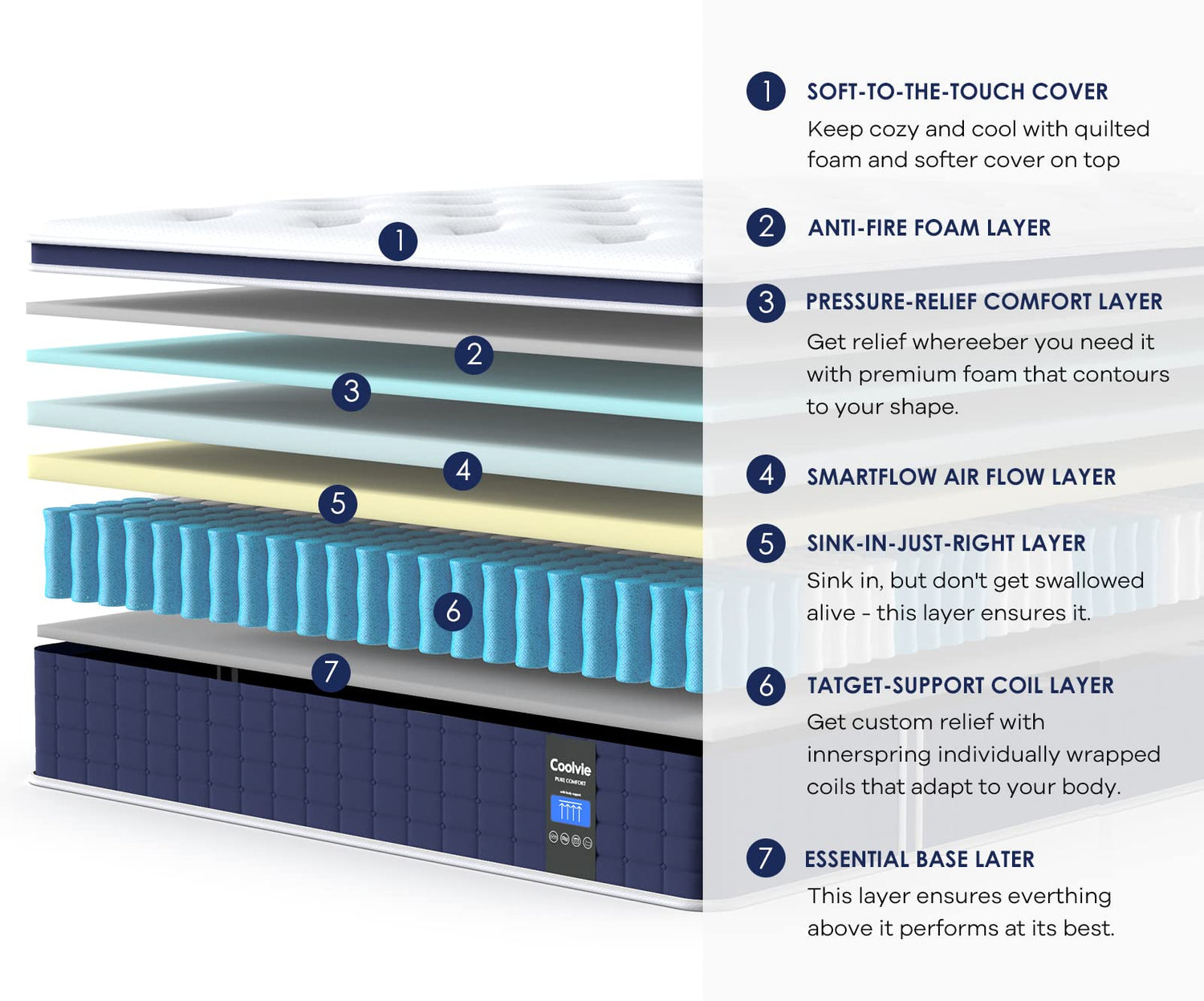 - 【 Less Interference and Pressure Relief】 Coolvie’s innovative 5-zone spring support systems are designed to work in perfect harmony with foams to ensure a balanced, refreshed sleep with less tossing and turning and minimal partner disturbance.The innerspring coil system adds a gentle bounce while effectively distributing your body weight from head to toe, ensuring even absorption and comprehensive support across the mattress.
