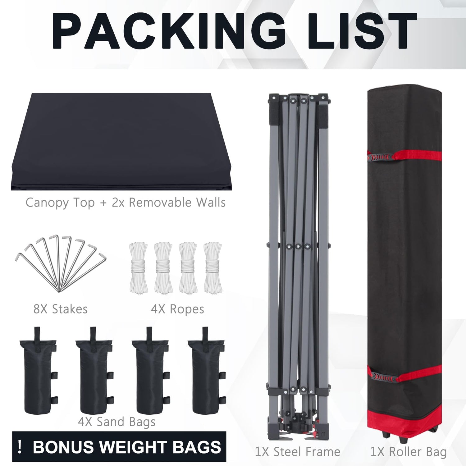 - 【PARTS INCLUDED】Fully assembled powder-coated steel frame,oxford fabric silver coated canopy top,2 Removable Side Walls,600D heavy stock wear resistant roller bag,4Xsand bags,8Xstakes and 4Xropes