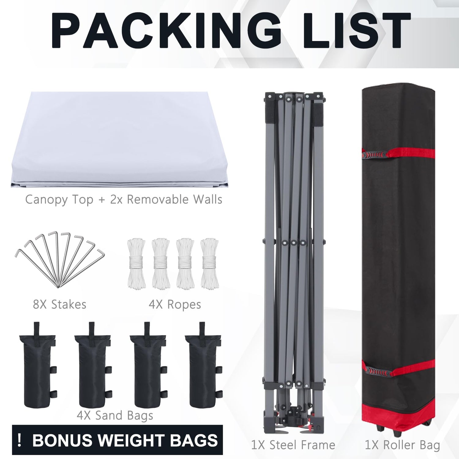 - 【PARTS INCLUDED】Fully assembled powder-coated steel frame,oxford fabric silver coated canopy top,2 Removable Side Walls,600D heavy stock wear resistant roller bag,4Xsand bags,8Xstakes and 4Xropes
