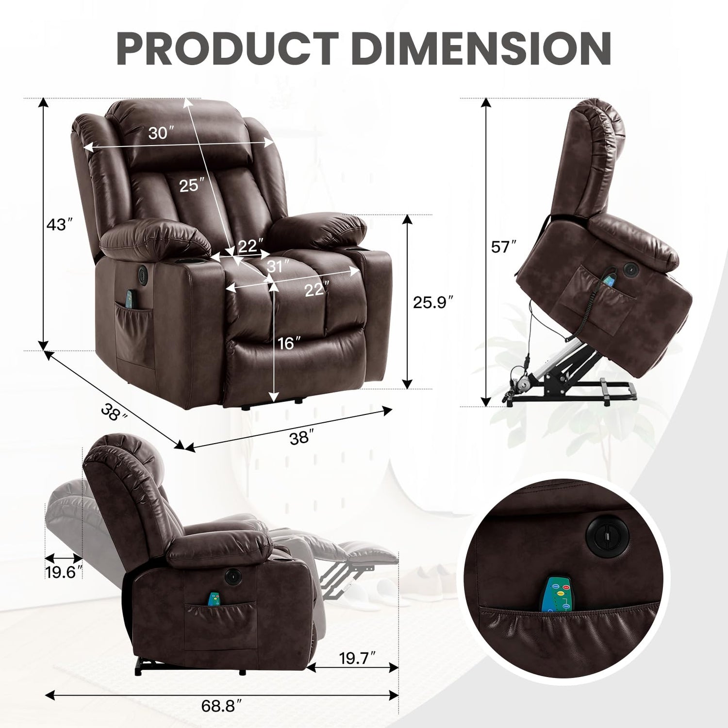 - [Practical Features]: We've added a lot of features to this extra large recliner. A remote control controls all the functions of the motorized lounge chair, the included USB port keeps your device charged at any time, two large side pockets for books or ipads, and two cup holders for drinks. Foot pedals can help you relax while reading, watching TV, or resting. Keep your body at its most relaxed at all times