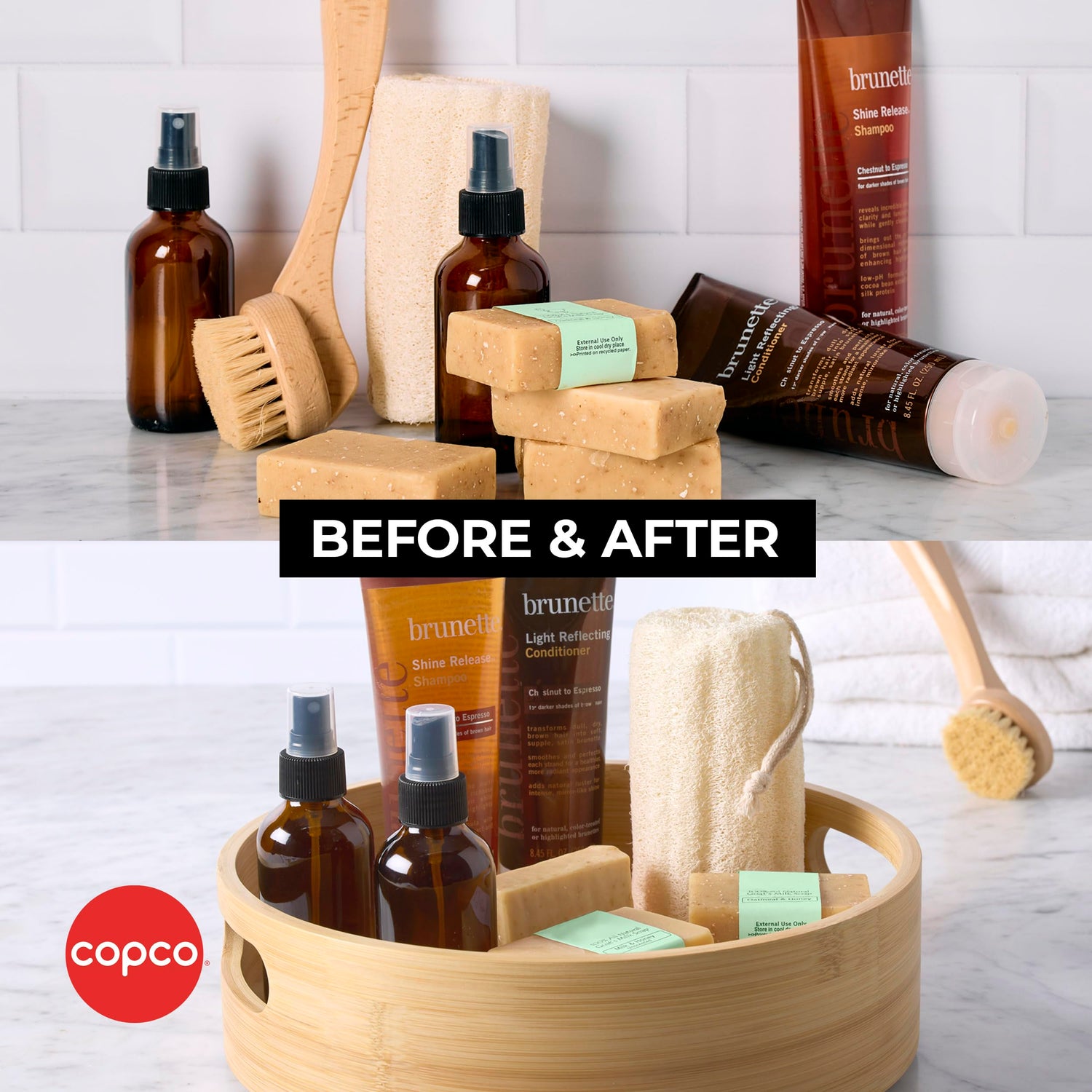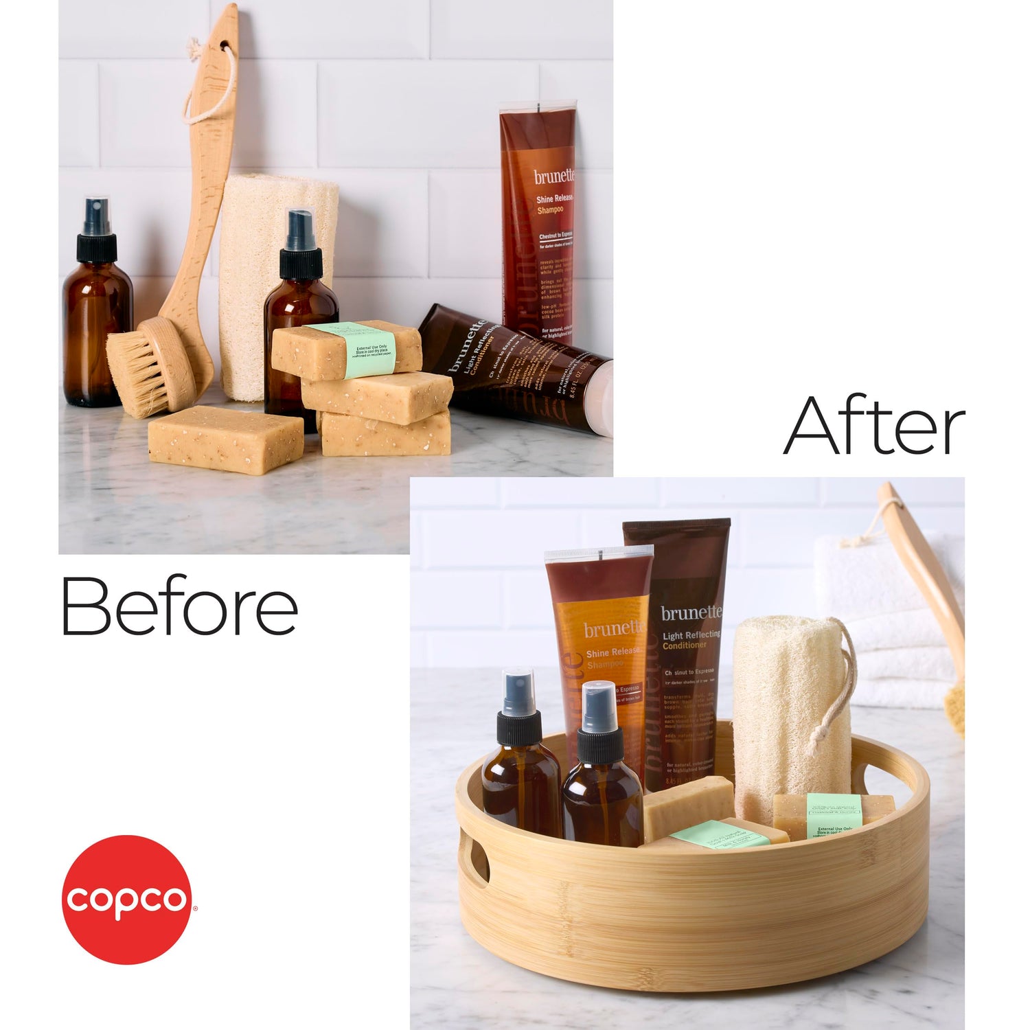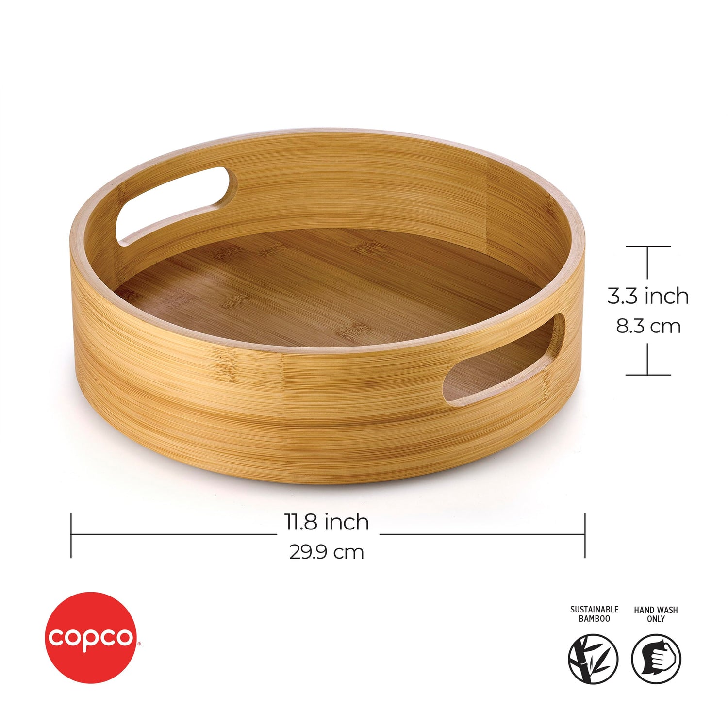 Details: Organize your kitchen, bathroom, home office, laundry room, garage, craft or hobby room, and more with this Copco Bamboo Storage Turntable. The sturdy, stylish, and sustainable bamboo construction stands up to heavy use. Ideal for over-head storage, it keeps items from getting lost in the back of hard-to-see and hard-to-reach shelves in closets or cabinets. This smooth-glide Lazy Susan rotates so you can quickly grab items, and features handles for easy transport. Plus, it has a raised rim that prevents items from falling off. Wipe clean with a damp cloth. Measures 11.8 inches in diameter and 3.4 inches in height.