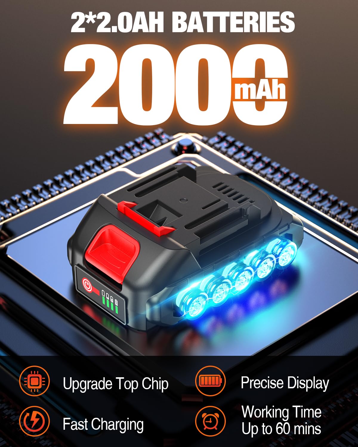 - đăTwo Powerful 2000mAh BatteriesăElectric ratchet wrench set equipped with two high-performance 2000mAh batteries, you can seamlessly alternate their use, ensuring you always have power at hand. Each battery offers up to one hour of runtime, and by using them interchangeably, you not only double your working time but also extend the battery lifespan, minimizing wear and tear for lasting performance.