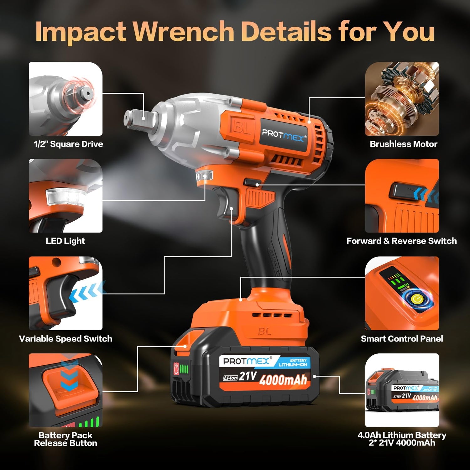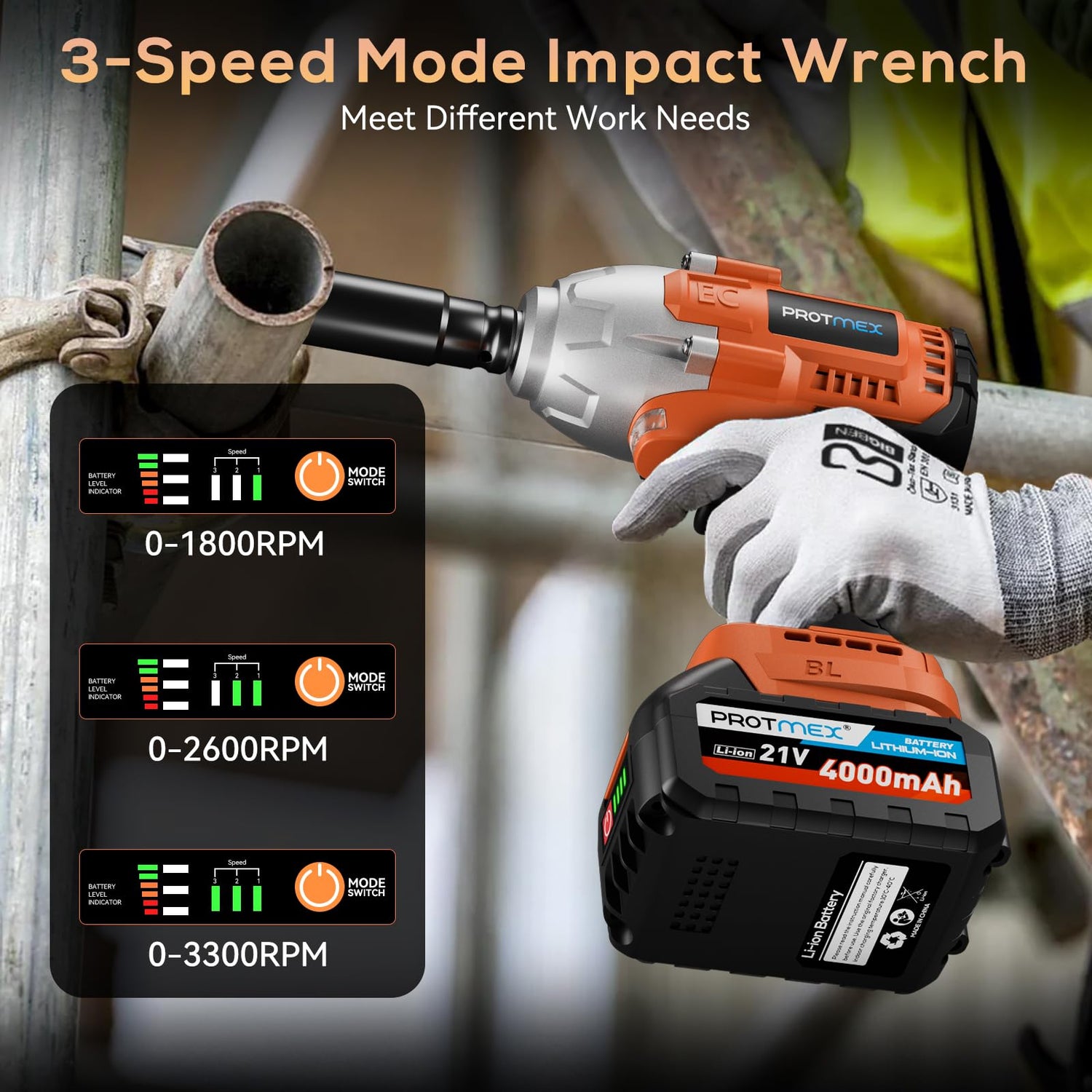- 【Powerful Brushless Motor - Up to 3300RPM】- 1/2-inch cordless impact wrench is faster and more convenient to use - with 3 speed modes (0-1800RPM/0-2600RPM/0-3300RPM). Compared with traditional motors, it is quieter, spark free, easier to use, and can extend the running time by up to 60.5%. It is also suitable for female and elderly users and is undoubtedly a professional tool in the workplaceusers and is undoubtedly a professional tool in the workplace