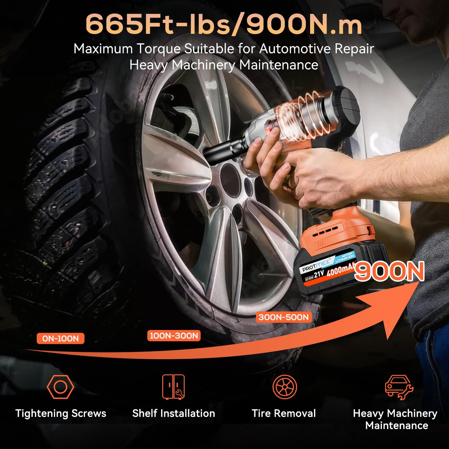 - 【900N·m Torque Impact Wrench– Up to 90% More Efficient】Say goodbye to exhausting manual labor. This cordless impact wrench delivers a massive 665 ft-lbs (900N·m) of max torque, making it a powerhouse for removing stubborn bolts, lug nuts, and rusted fasteners with ease. Compared to traditional manual wrench, it boosts work efficiency by up to 90%, saving you time and effort on every task. Whether you're tackling automotive repairs, construction jobs, or heavy-duty maintenance, this impact wrench ensures faster, smoother, and more reliable performance