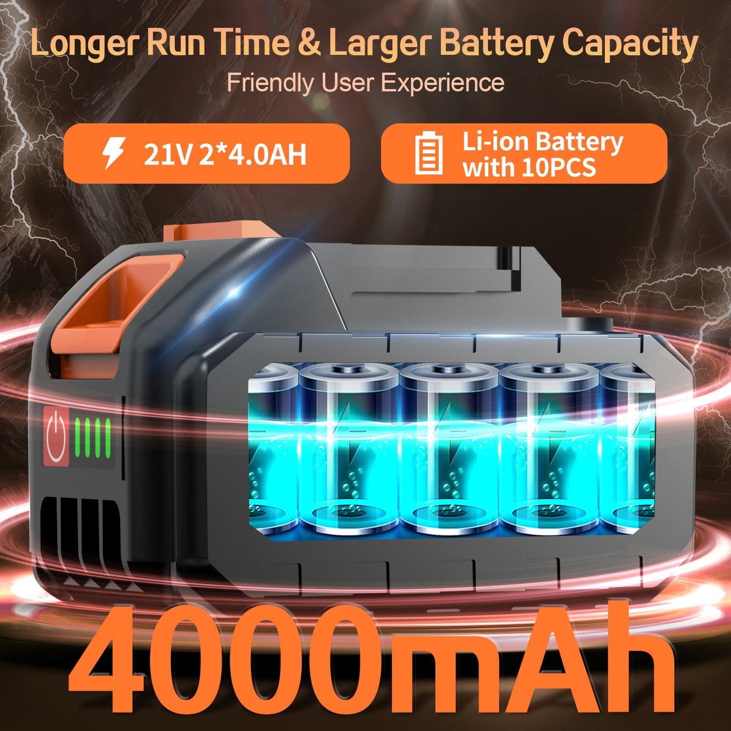 - 【2x 4.0Ah Batteries & Fast Charger - Work More Efficiently】- The rechargeable compact wrench is equipped with 2 x 4.0Ah battery pack, (21V battery contains 10 pieces) which allows the wrench to work for a long time, and is equipped with a charger that fully charges in 90 minutes, allowing you to work easily