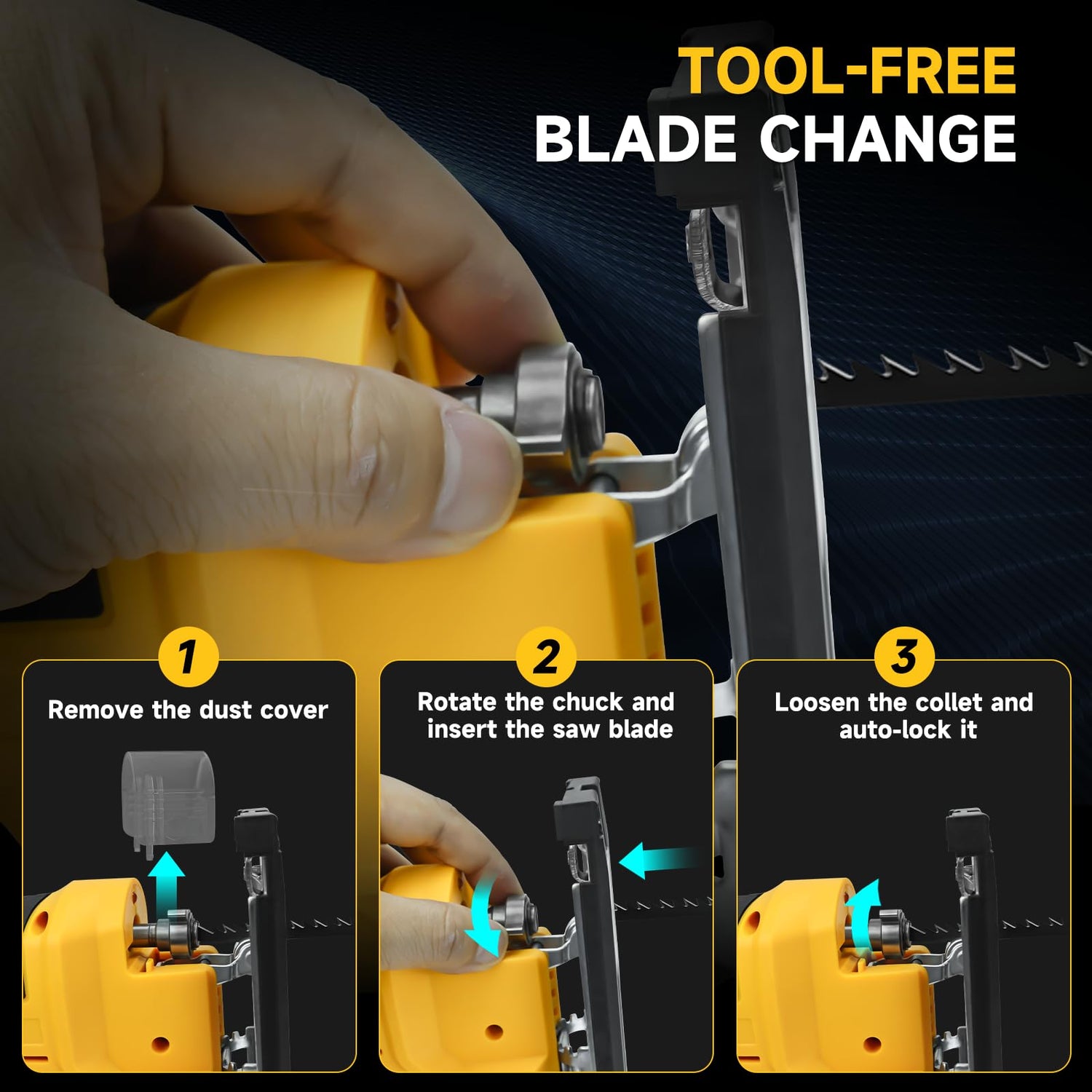 - 【Tool-free Blade Change】This Jig saw with three blades has a self-locking collect for safe and quick manual blade changes without additional tools