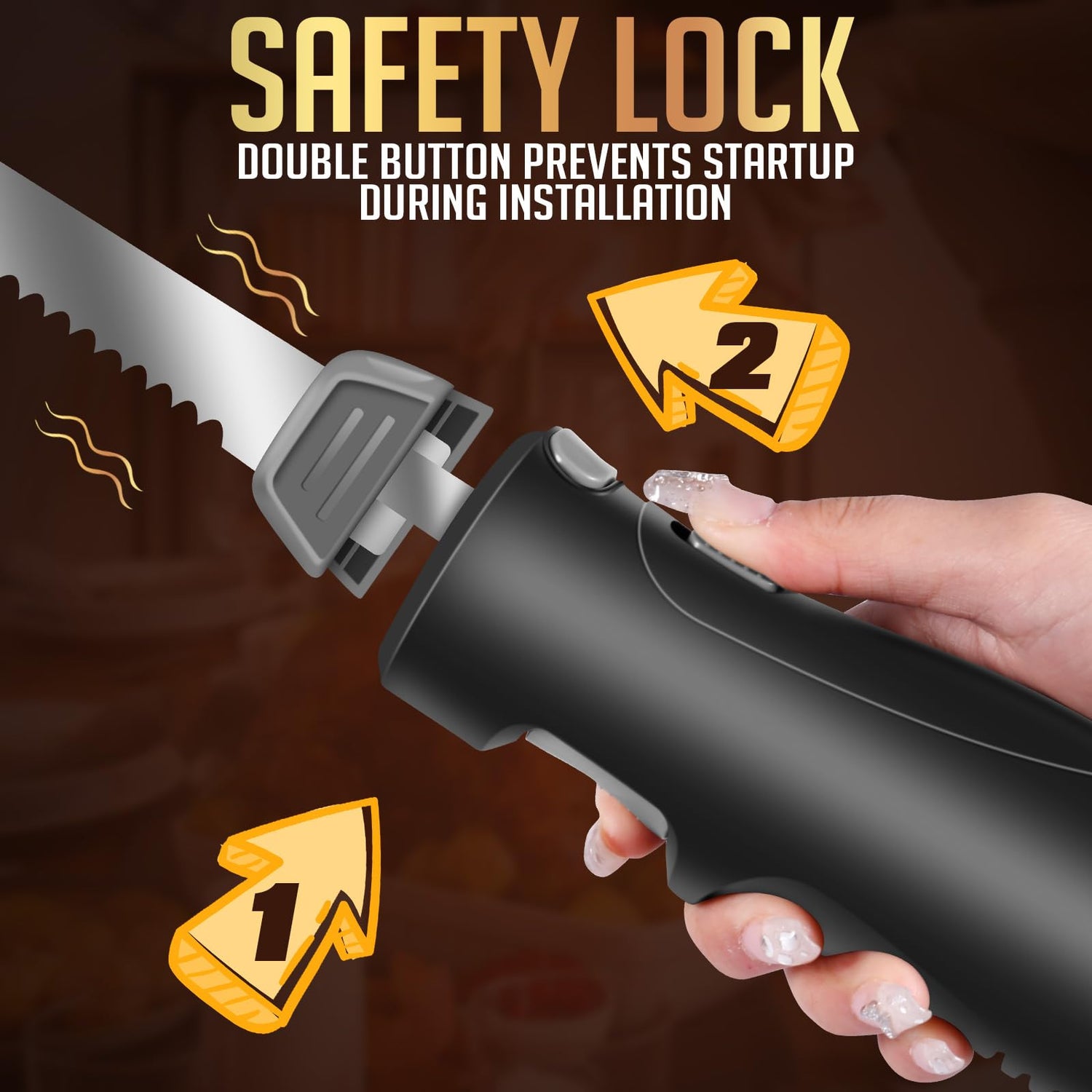- 【Safety Locking System】The cordless electric bread knife is equipped with a blade locking system to keep the blade securely in place during use, preventing accidental drops. The dual-switch button design requires pressing both buttons simultaneously to start, enhancing safety and preventing accidental activation