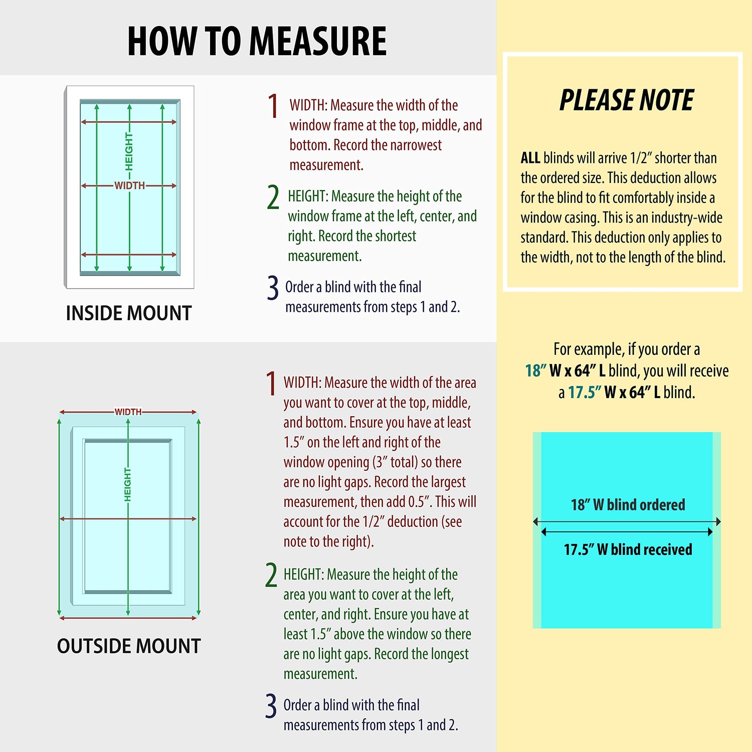 - WHAT SIZE TO ORDER: This blind will be exactly 31.5 inches wide to ensure the perfect fit inside a window frame that is 32 inches wide. All Lumino blinds are precision-cut to be ½" narrower than the ordered width, providing the ideal inside mount. Please measure carefully – see image with instructions to ensure the optimal fit. The sizes listed are WIDTH x HEIGHT.