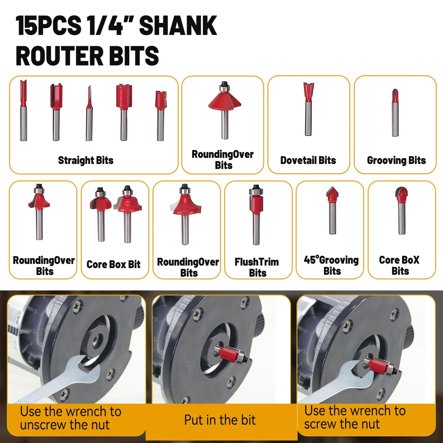 - Widely Used: The handheld router can accommodate most 1/4-inch drill bits and is widely used in various wood processing, such as fancy trimming, craft carving, board grooves, furniture making, handcrafting, other similar DIY materials, chamfering, shaving wood edges, curve cutting, surface treatment