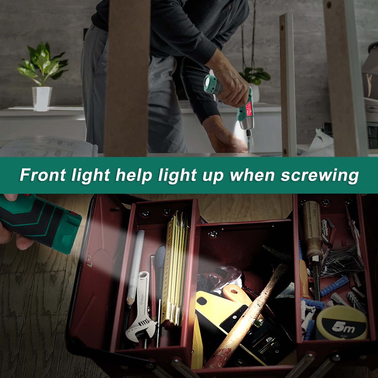 - 🌟[LED LIGHT AND ALSO AS A FLASHLIGHT] The front LED light is good for dark environments or dark corners. It can also be used as a flashlight for lighting in dark places. The handle can be adjusted in two positions. Press and hold the lock button to rotate the handle position, which is suitable for use in confined spaces. With the storage box is easy to carry and store your cordless screwdriver and accessories.