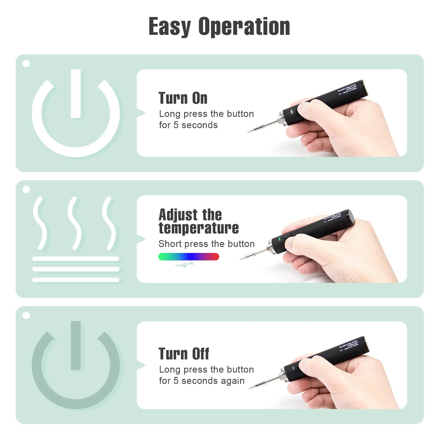 - ✅ 【Easy To Use】: One button to use, long press for 5 seconds to turn on/off, short press to adjust the temperature. The portable soldering iron comes with rosin, solder wire and stand, making it easy for you to master professional soldering techniques.