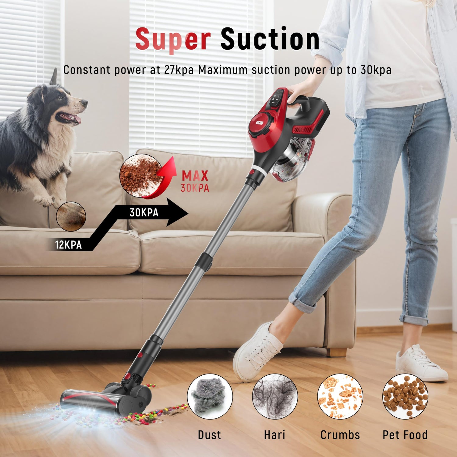 Cordless Vacuum Cleaner, 30Kpa Home Stick Vacuum, Smart Display & 1.5L Dust Cup, 55mins Max Runtime, Rechargeable Lightweight Handheld Vavuum for Pet Hair/Carpet/Hardwood Floor/Car